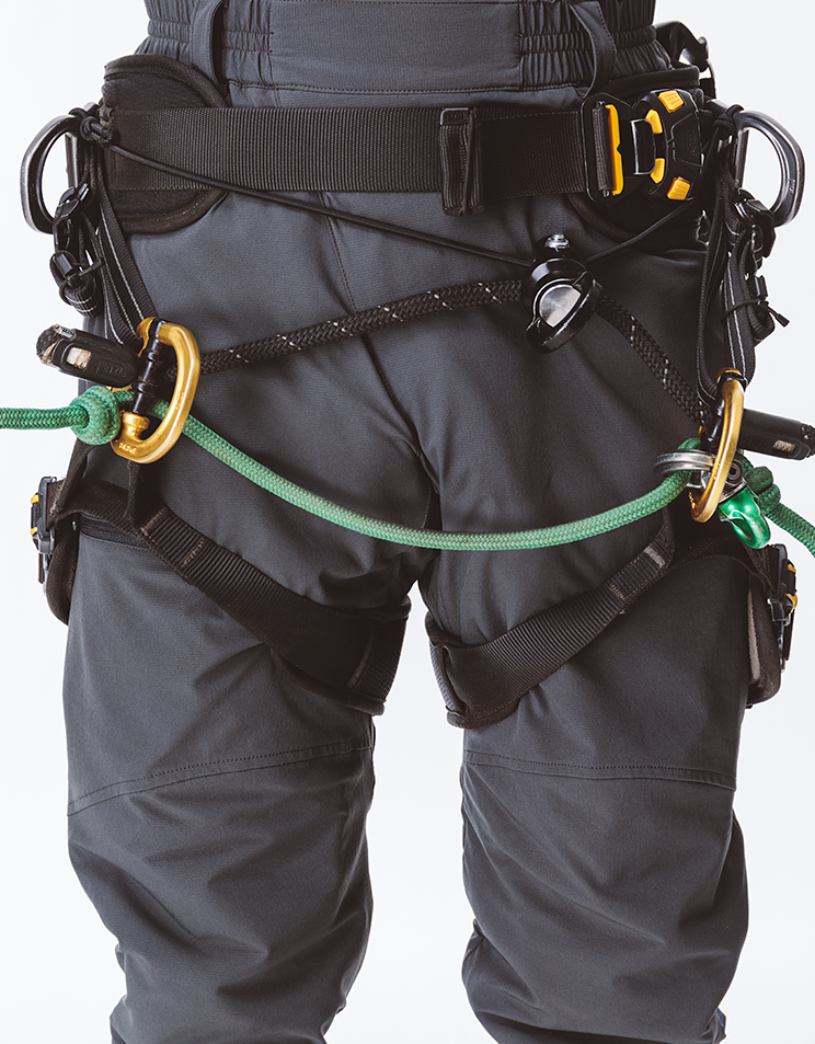 裾は絞ってフックで固定、フットアッセンダーを邪魔しない。