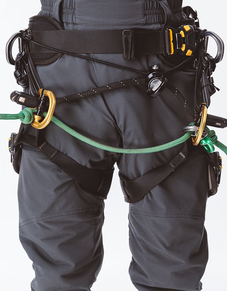 日本の夏は蒸し暑いので、歩きやすく登りやすい軽量なパンツが重要な要素でした。ズボンの形は、伝統的な庭師のユニフォームからインスピレーションを得ており、ゆったりとした太ももとスリムな膝下を備え動きが制限されずフットアセンダーの邪魔をしません。アッパーポケットはなく、深いクロッチと組み合わせることで、ハーネスからのピンチポイントを排除します。