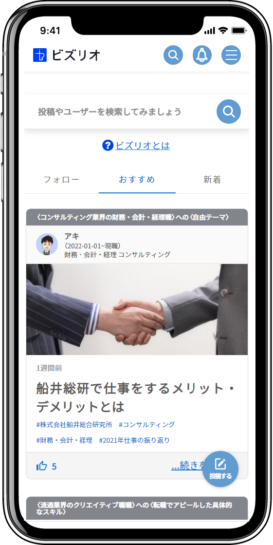- ユーザーによる「リアルな」転職経験談の投稿記事をフィードで追える
