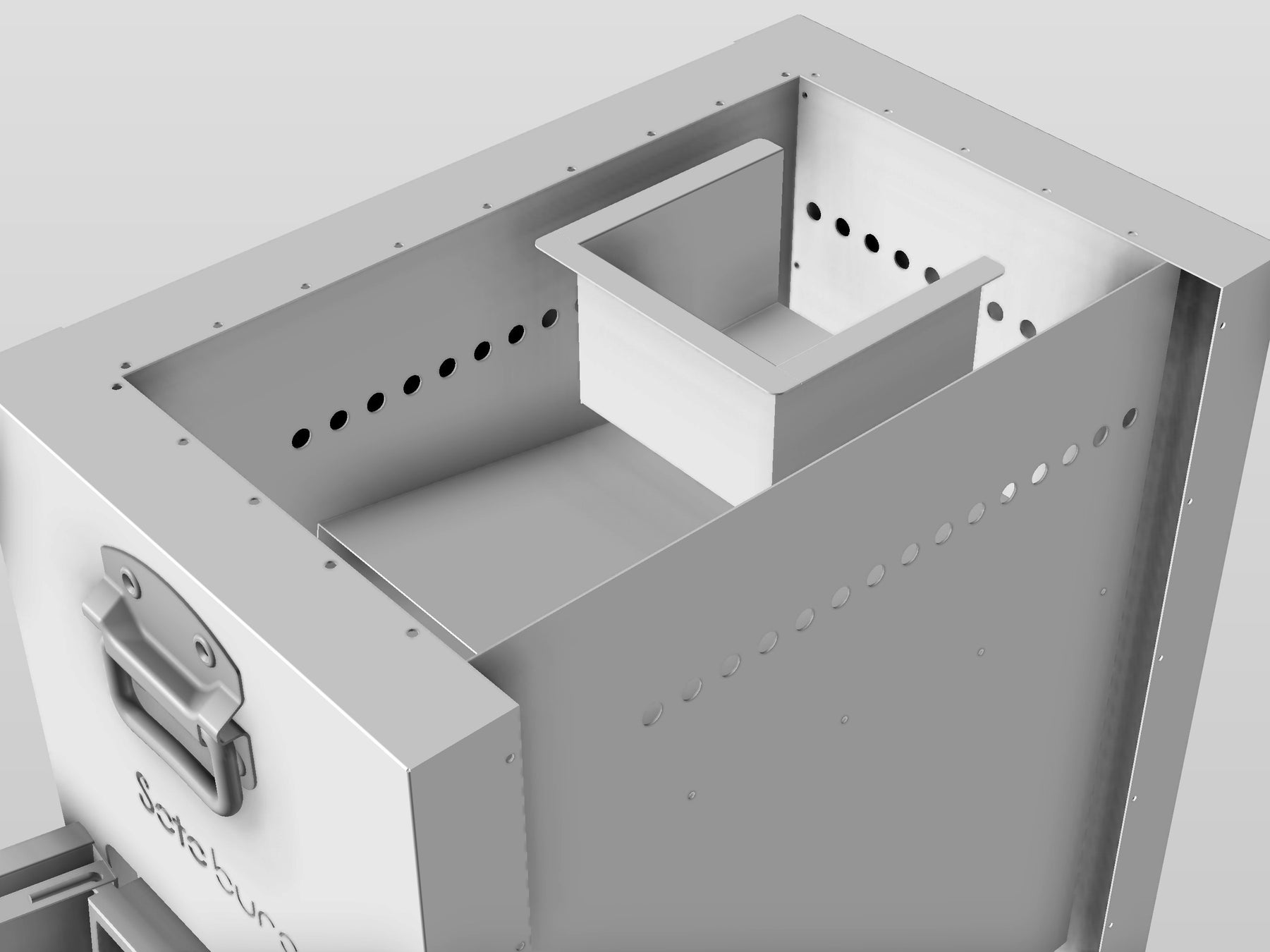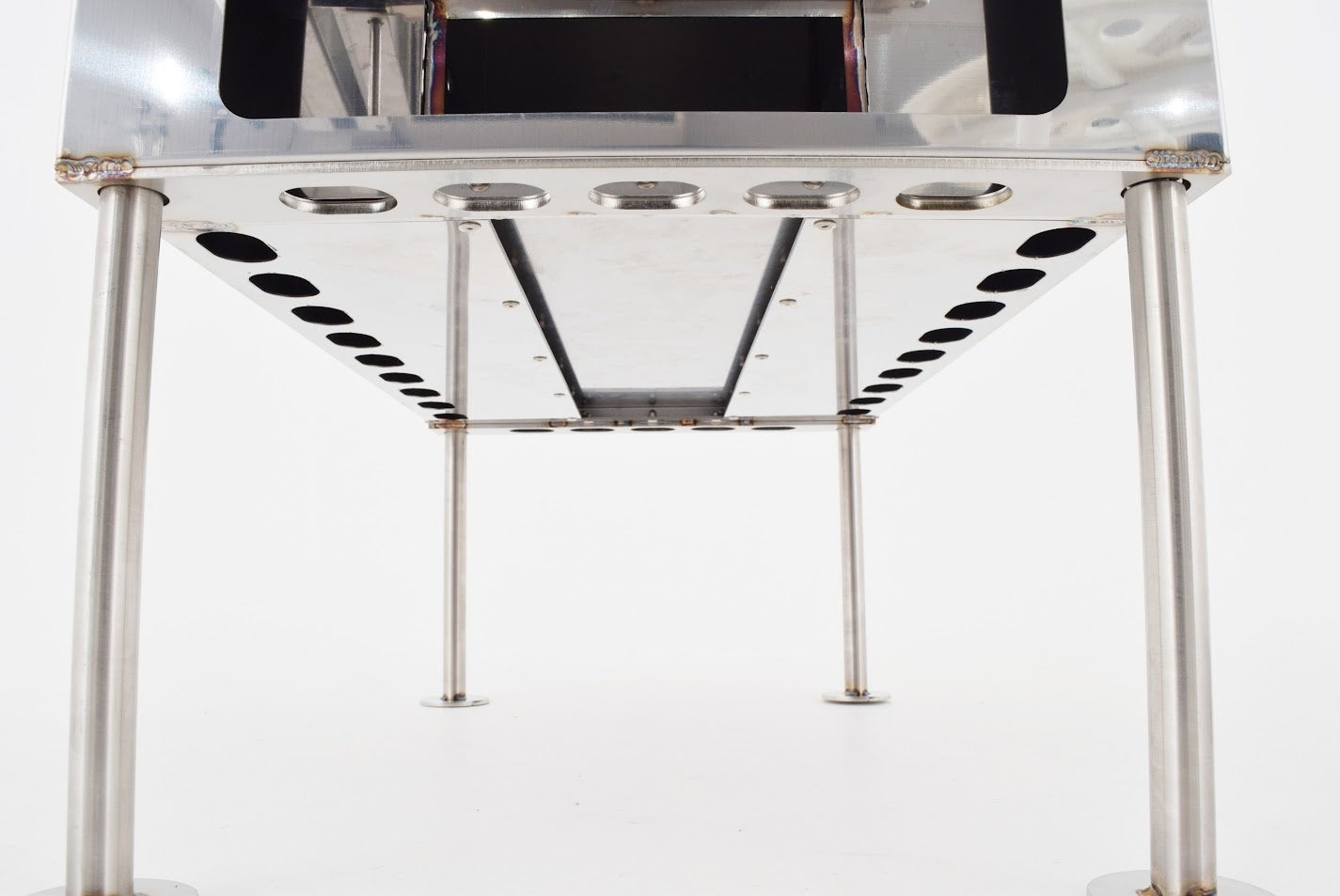 薪受け下のプライマリーエアー(1次空気)用の吸気孔により1次燃焼を促します。灰受け皿は従来のものより幅を狭く・高さを深くし、奥の壁をなくすことで灰や熾をスコップのようにすくって火消し壺に納めることが簡単にできるようにしました。