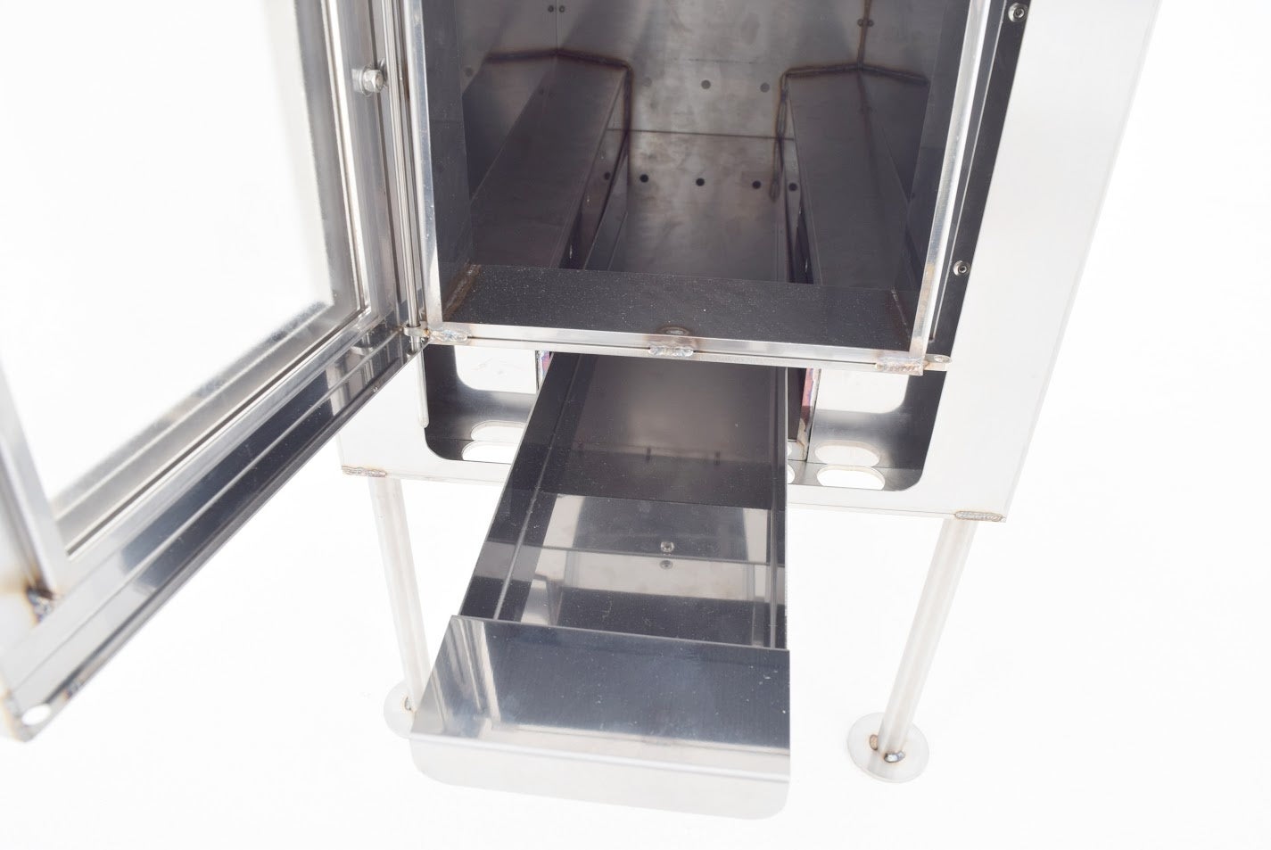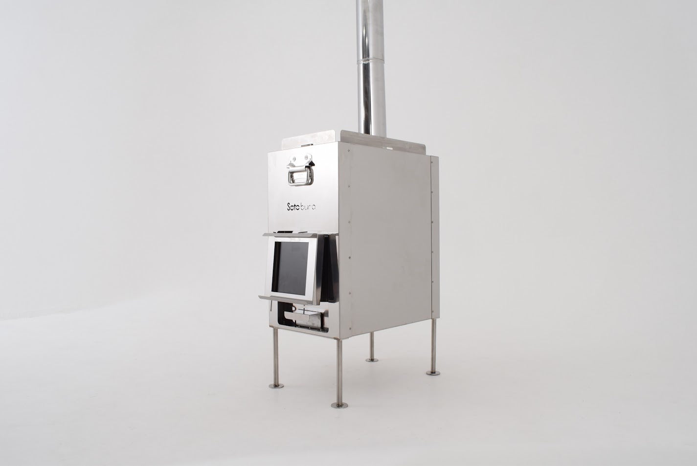 ストーブ脚はステンレス製(SUS303)で、無垢材から切削してネジ切りをすることで美しい仕上がりになりました。取手はSUS304を使用、その他はSUS430を使用しています。