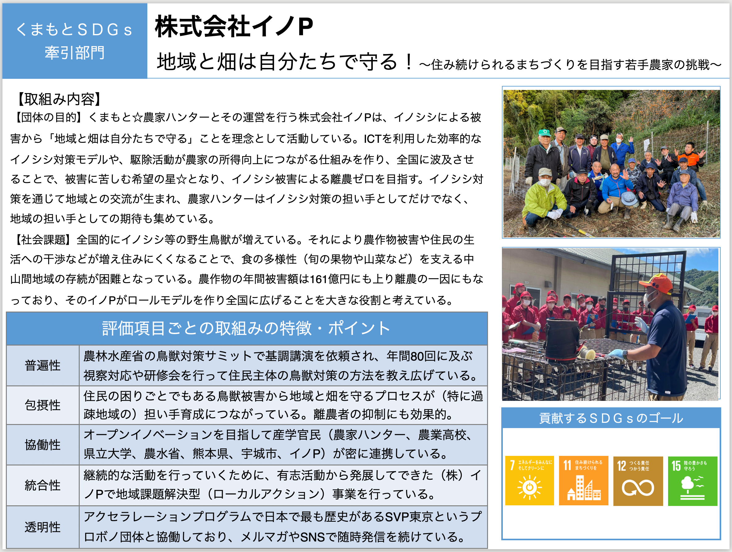 2016年4月から、地域を守る消防団のように、野生鳥獣から地域や里山を守る活動を始めた株式会社イノP(くまもと☆農家ハンター)。2018年からSDGsのゴールを念頭においたローカルアクションを重ねてきました。今回の受賞を励みに、ますますサステナブルに、地域の課題解決に挑んでいきます。