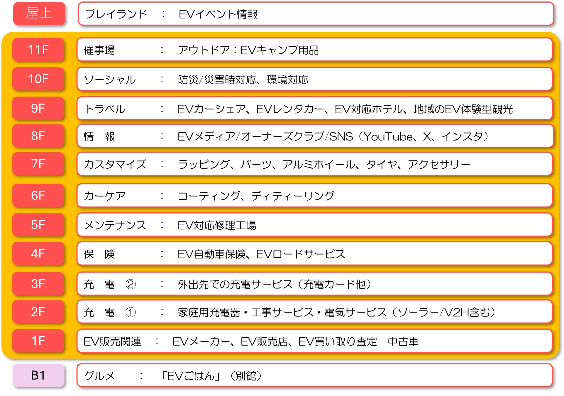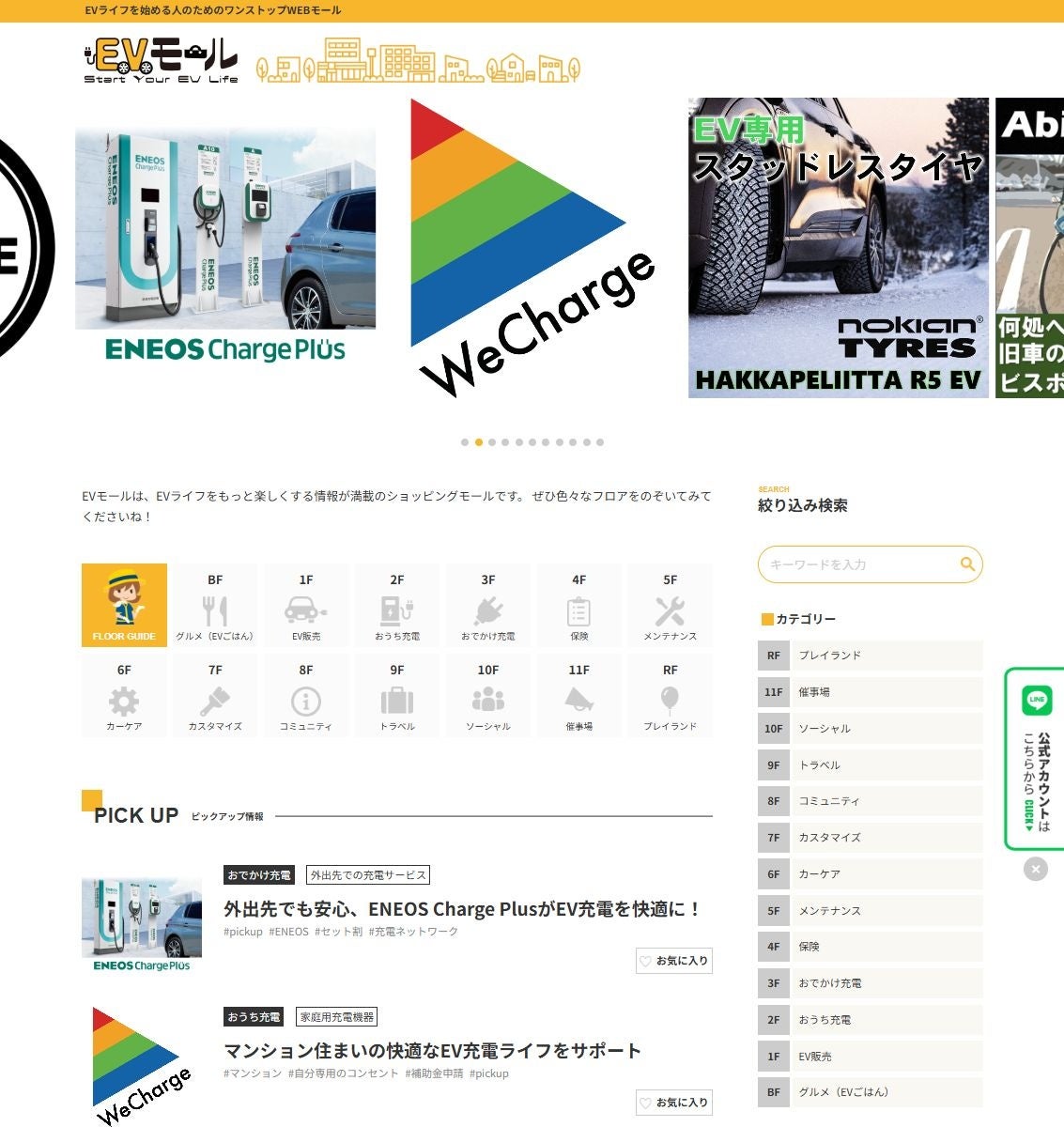 特 徴 : ・EV車両販売から、充電(基礎充電、経路充電)、保険、カーケア、メンテナンス、コミュニティなど、EVライフに関わるあらゆる情報カテゴリーを、デパートのフロアに見立て、分かりやすく親しみやすいトーンで紹介。
