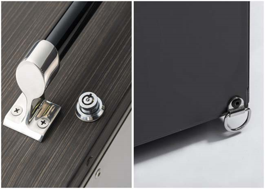 弊社では防犯対策として、解錠されにくく、楽に施錠ができるプッシュ錠や宅配ボックスごと盗難に遭わないよう本体そのものに盗難防止用のフックを装備し、セキュリティ性を強化しました。
