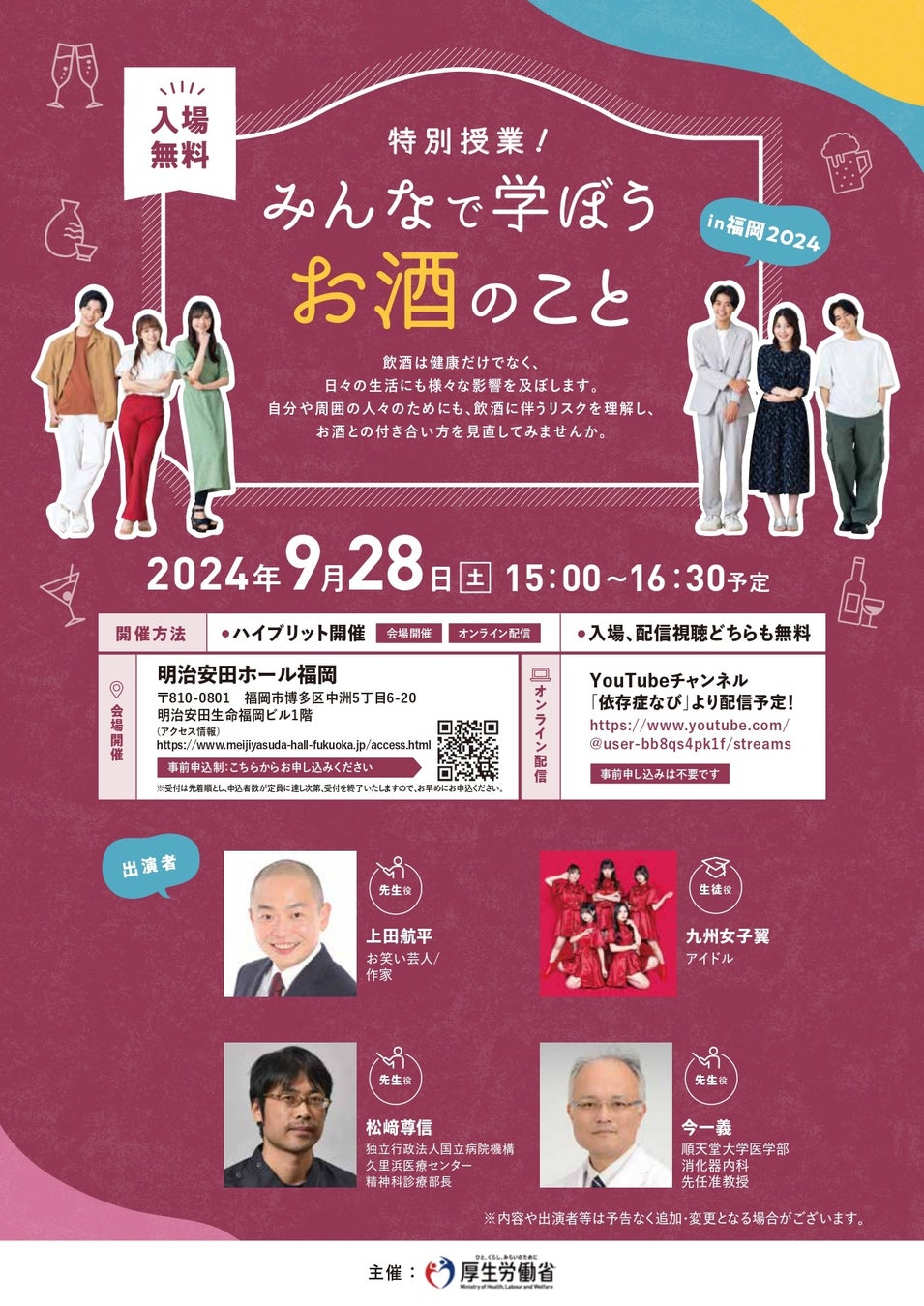 2024年9月28日(土)に明治安田ホール福岡で、依存症の理解を深めるための普及啓発トークイベント「特別授業!みんなで学ぼうお酒のことin福岡2024」を開催します。