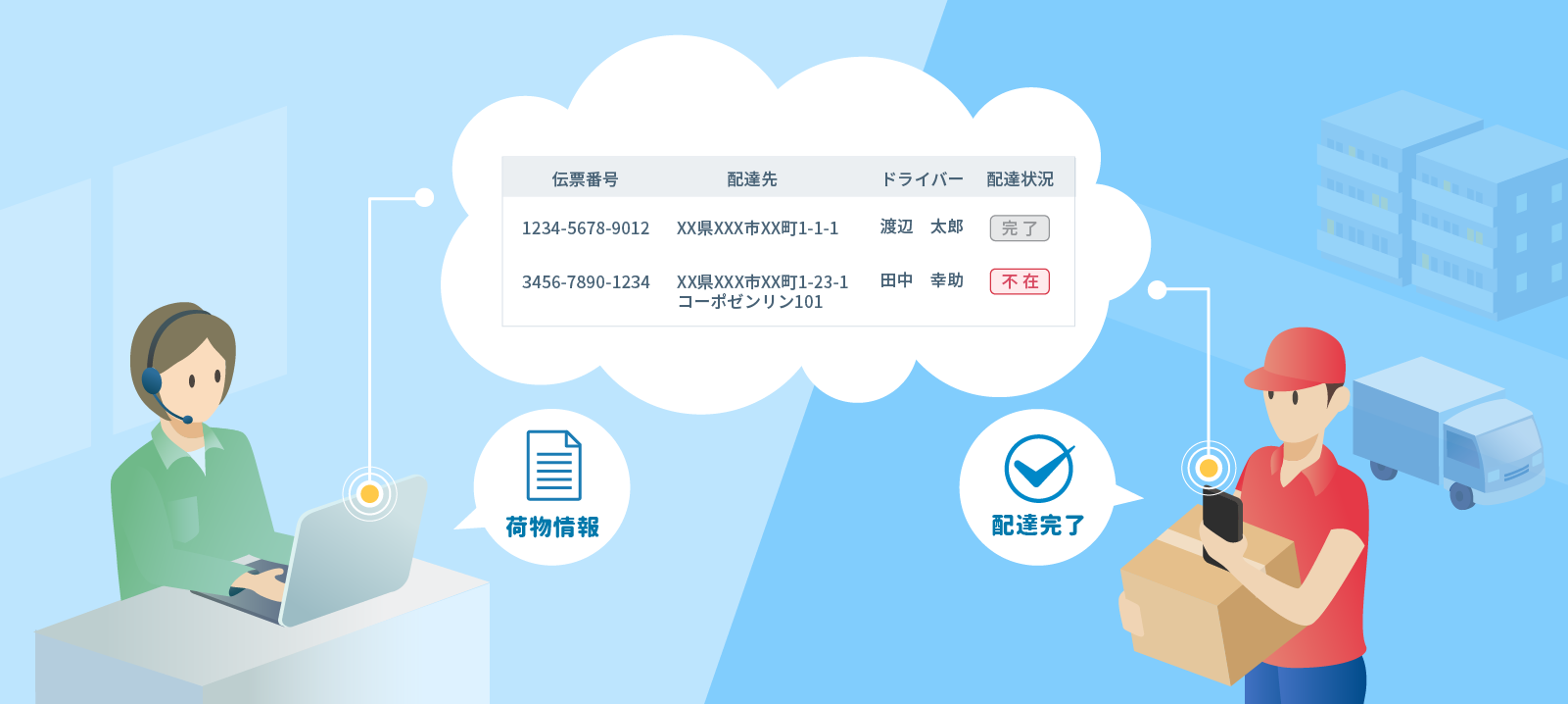 配達中・不在・配達完了などのステータスがバックオフィスでリアルタイムに確認できます。