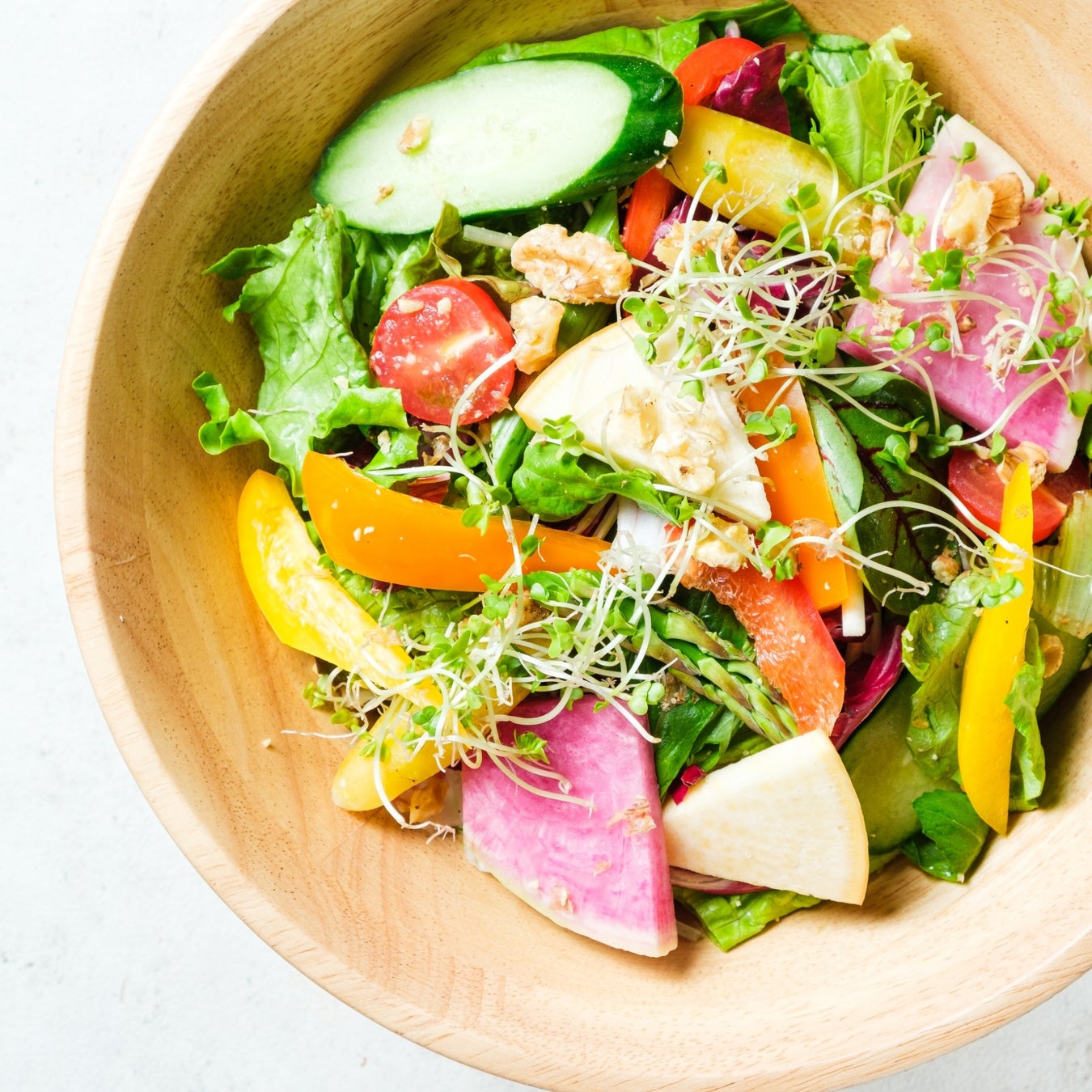 その日仕入れた国産野菜や有機野菜とローストした胡桃をたっぷりと乗せたサラダ。