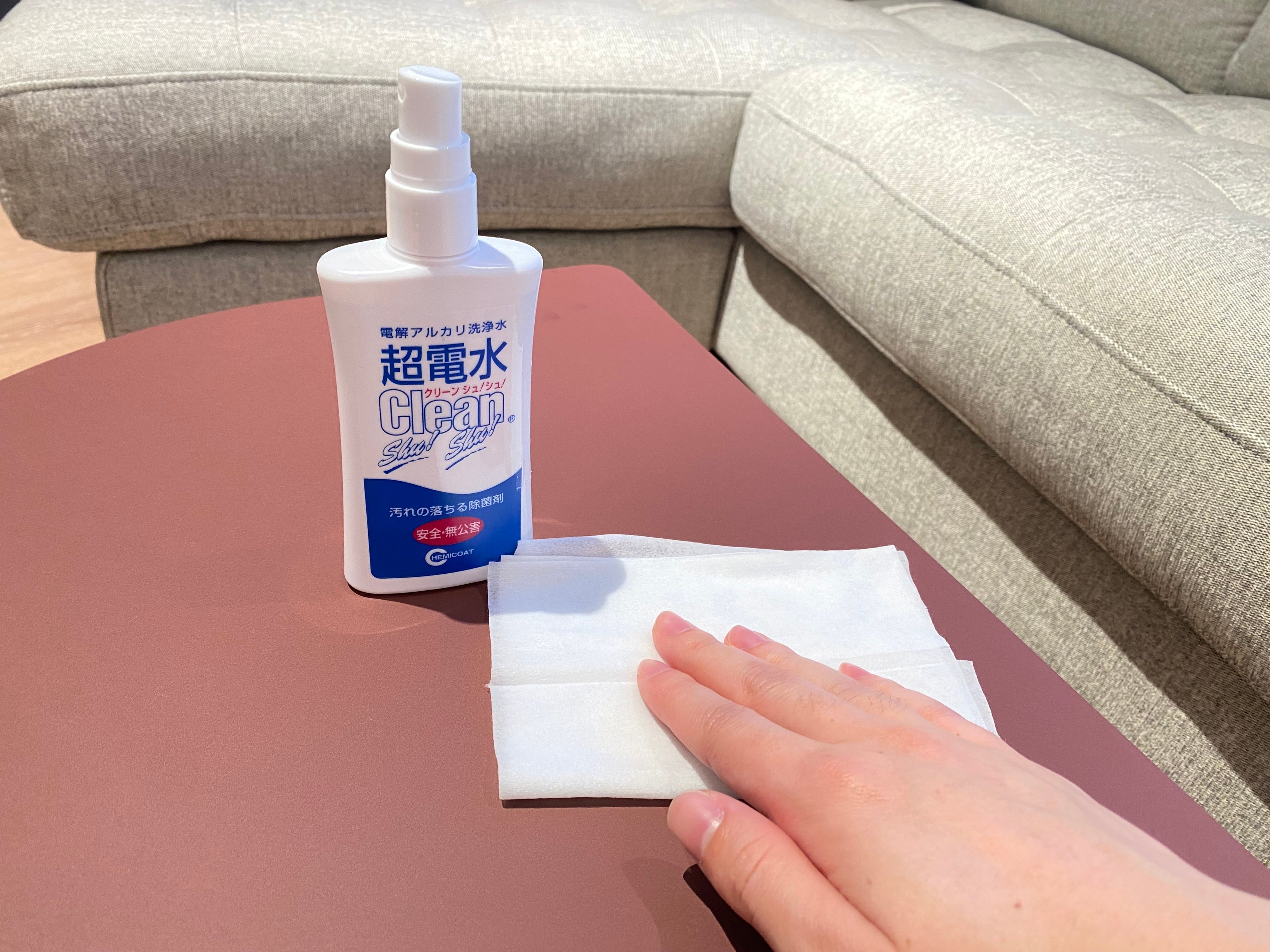 もしくは、超電水クリーンシュ!シュ!を吹きかけてテッシュやタオルで摘まむようにして吸い取るとしみ抜きが出来ます。