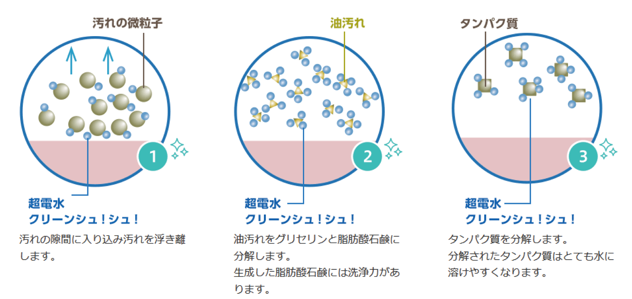 超電水クリーンシュ!シュ!は水を電気分化して作られた『アルカリイオン水100%の除菌洗浄水』