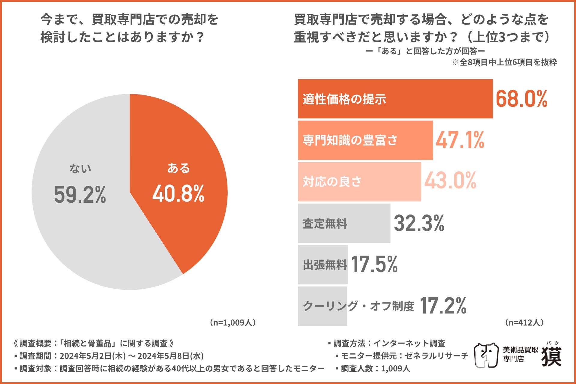 さらに、「ある」と回答した方に、「買取専門店で売却する場合、どのような点を重視すべきだと思いますか?(上位3つまで)」と質問したところ、『適正価格の提示(68.0%)』と回答した方が最も多く、次いで『専門知識の豊富さ(47.1%)』『対応の良さ(43.0%)』と続きました。