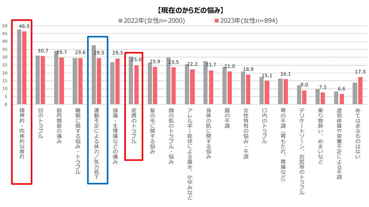 昨年同様、「精神的・肉体的な疲れ(イライラ、疲れが取れないなど)」が圧倒的に最多は変わらず。「皮膚トラブル(肌荒れ、ニキビ吹き出物,湿疹、皮膚炎、やけど、キズ、シミ、あせもなど) 」、は25%と4人に1人が悩んでいる事が分かりました。また、昨年2位だった「運動不足による体力/気力低下」が減少し5位となっており、コロナ収束に伴う外出機会の増加、巣ごもりの解消などがうかがえます。