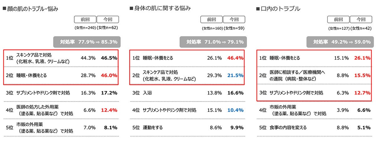 顔・身体の肌トラブル対処法のTOP2は「睡眠・休養」「スキンケア品」