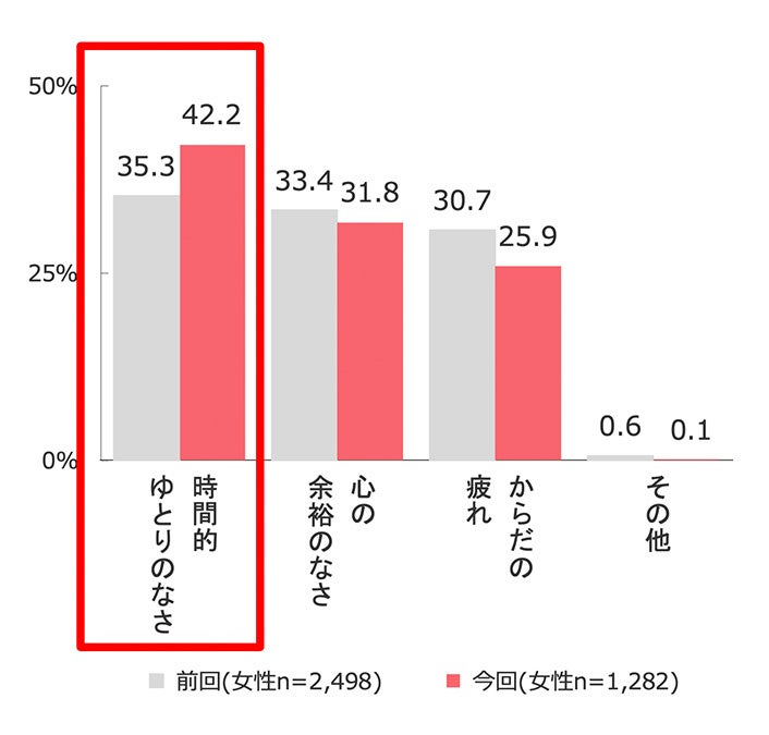 アフターコロナの女性の悩みの変化とは?「疲れ」が47%と約半数で最多。「運動不足」が減少。忙しさの種類として「時間的ゆとりがない」が増加