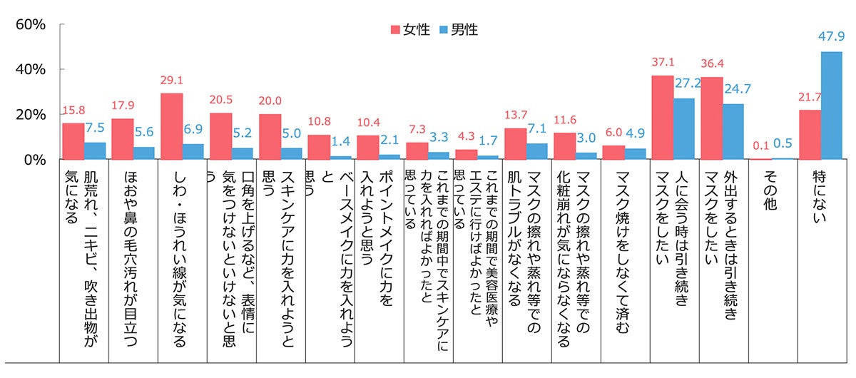 マスクなし生活に向けて気になることは、男女ともに「人に会う時は引き続きマスクをしたい」「外出する時は引き続きマスクをしたい」がTOP2となりました。女性は男性に比べて平均回答個数が1.3個多く、特に「毛穴、しわ・ほうれい線、表情、スキンケア」など、マスクを外した時の外見に関する要素が高くなっています。