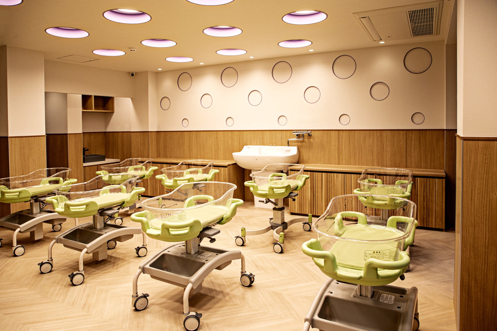 - 24時間体制のベビールーム:生児のお世話全般・沐浴・身体測定・黄疸測定・粉ミルク授乳など