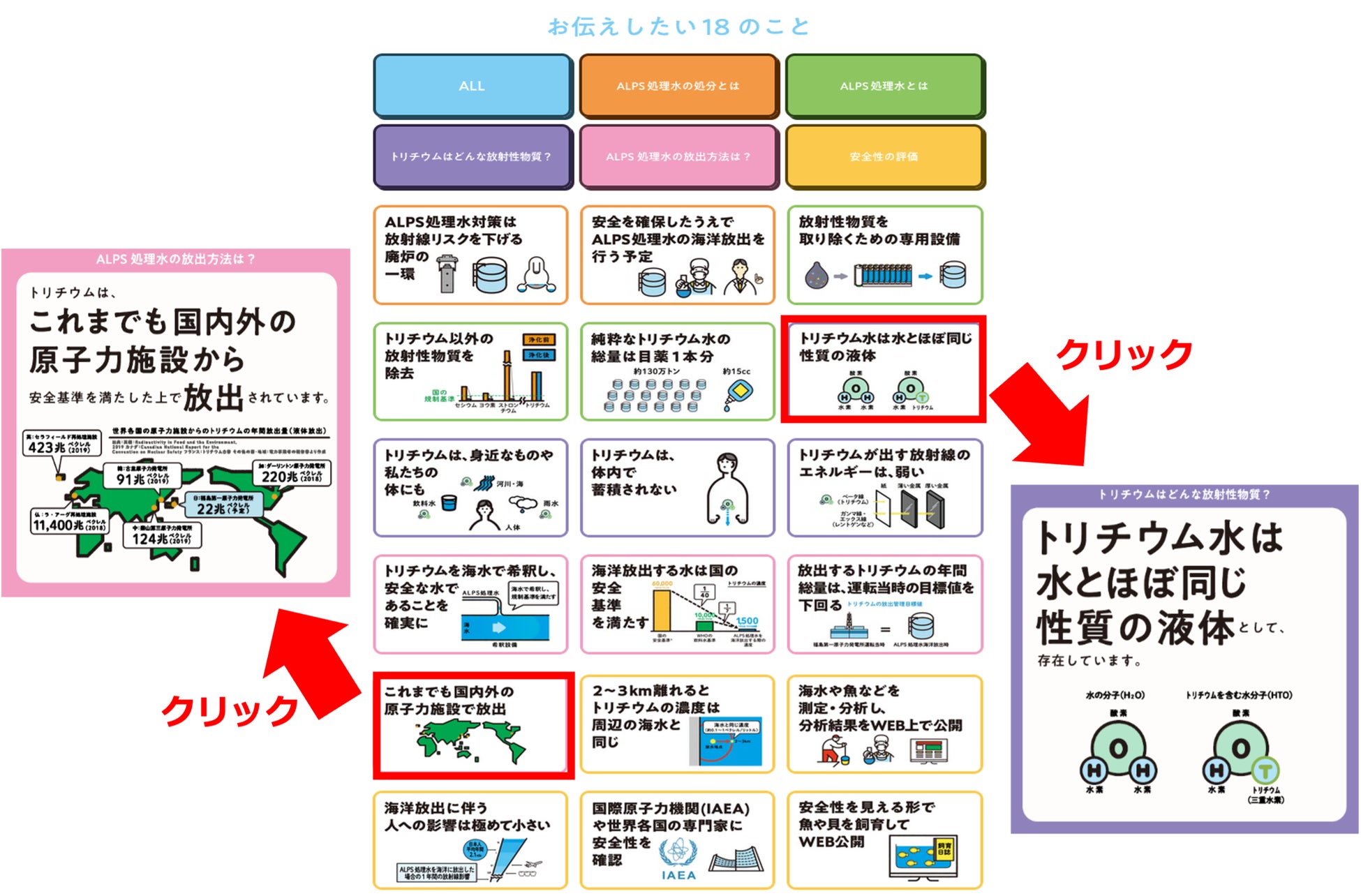 「ALPS処理水の処分」「ALPS処理水」「トリチウムの性状」「海洋放出の方法」「安全性の評価」の5つのカテゴリー分けを行い、お伝えしたいポイントを18にまとめました。