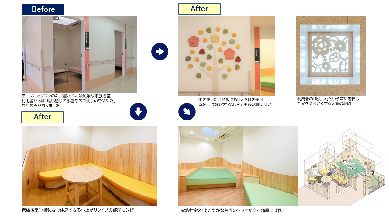 CFでの支援金をもとに、ソファとイスのみが置かれた殺風景な2室を、草苅木工株式会社(代表取締役会長 草苅宏明、所在地 つくば市)の協力を得て、茨城県産ヒノキ材を使用し改修。利用者が木の温かみを感じられるようにデザインしたほか、天窓には草木をモチーフとした木材の装飾を施しました。これにより、天窓からの強い日差しがやさしく調整され、日中の時間帯でも、休息をとりやすい環境が期待されます。