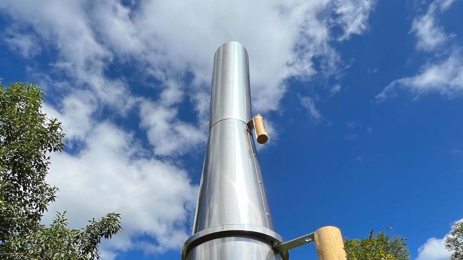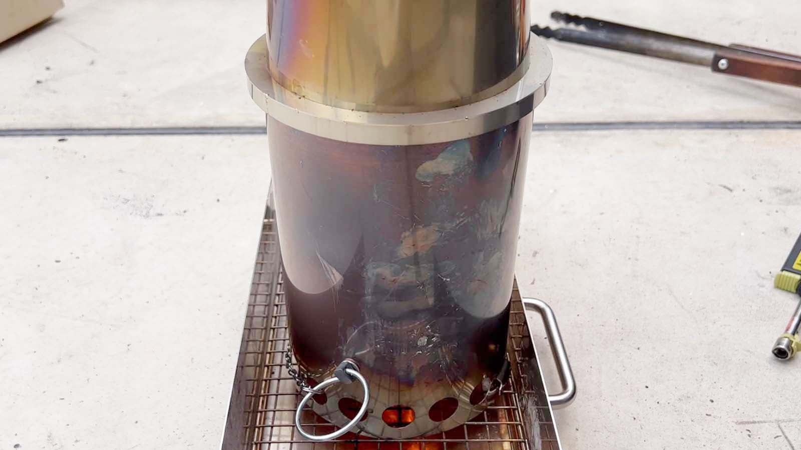 「ルケーノは三段分割構成になっています。全て重ねると80cm近い高さの煙突構造ですが、中間に円錐形状煙突を採用することにより、先端に行くほど軽くなる低重心を実現。背が高くても倒れにくい構造になっています。