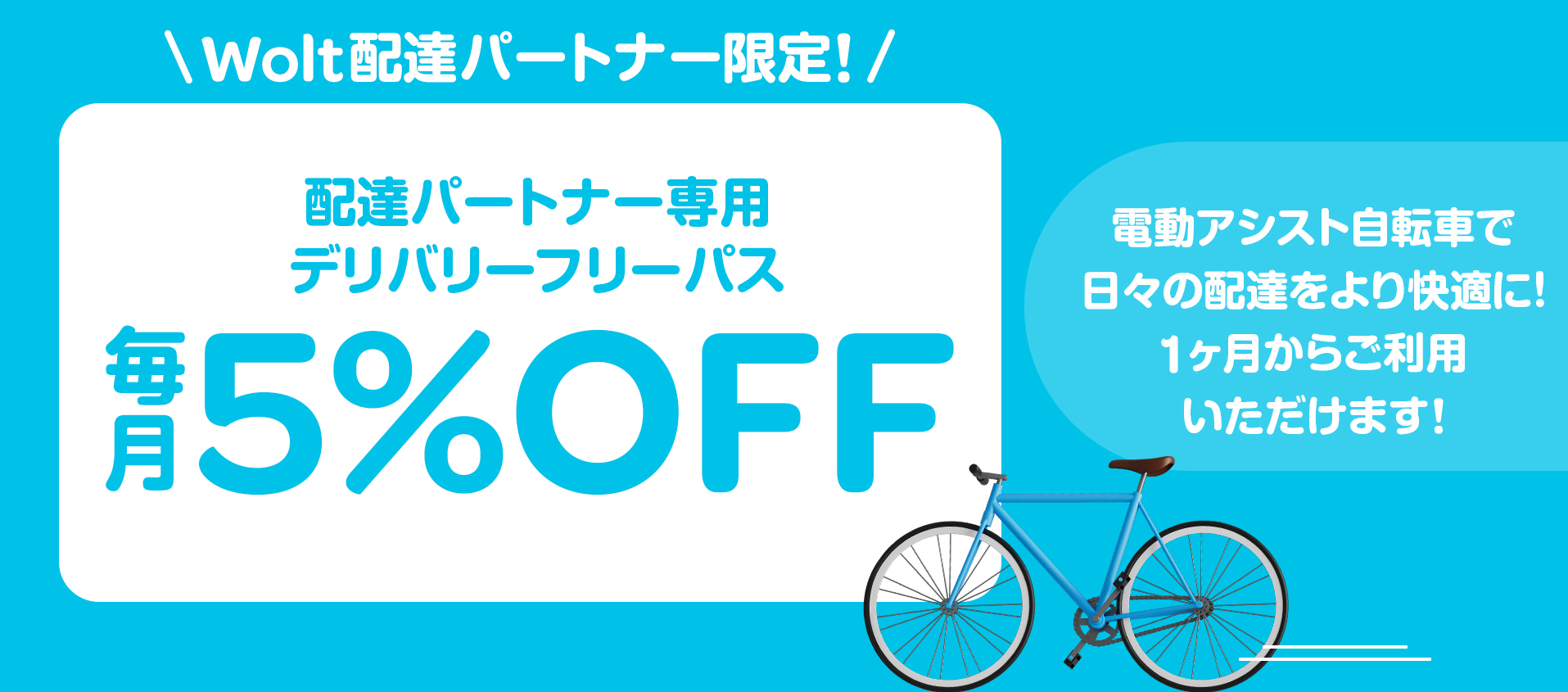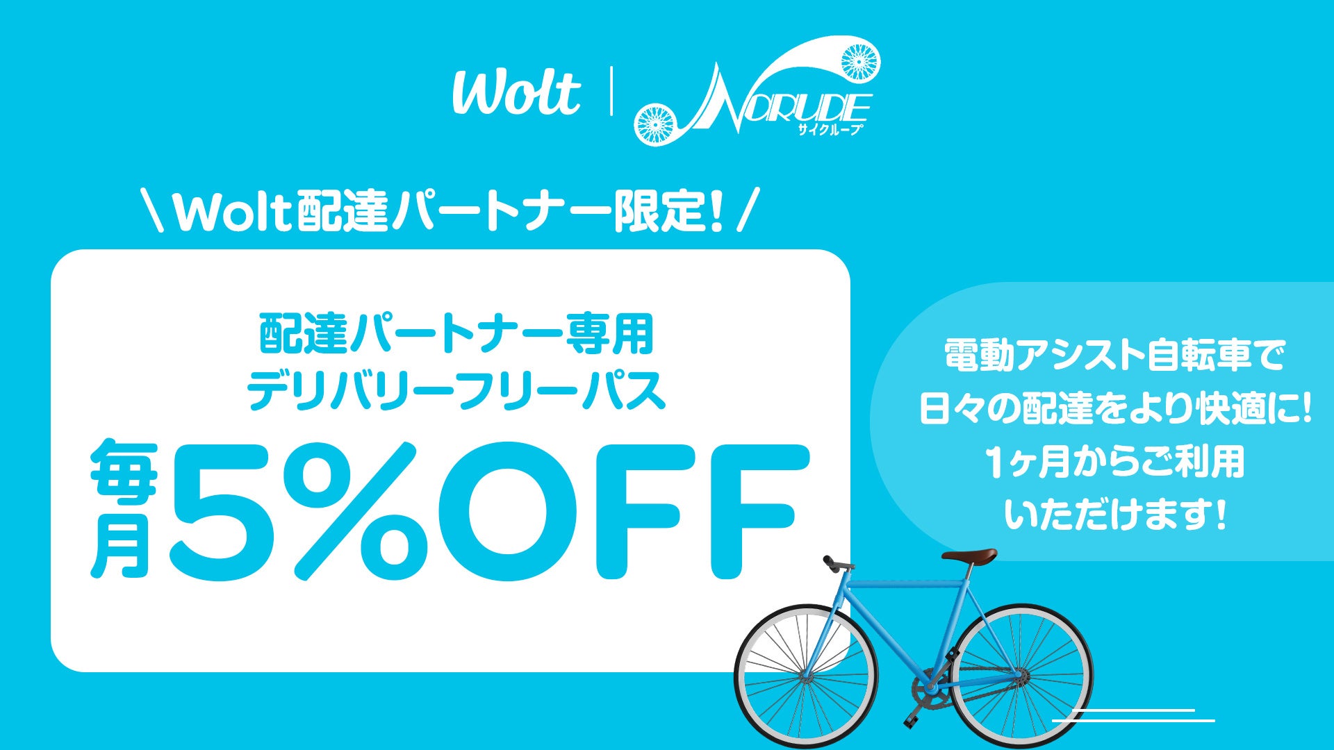 フードデリバリーサービス「Wolt」様の配達パートナー限定の特典クーポンを発行し、サブスクお申込み時に配達パートナー専用アプリに表示されている特別クーポンをご入力いただくことで、車体月額利用料が毎月5%OFFとなります。