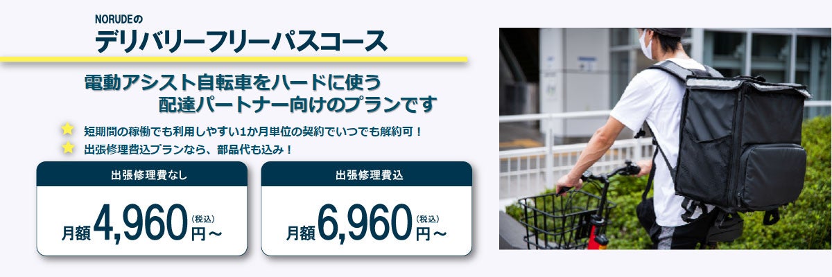 NORUDEは、デリバリー配達パートナーの方に向けて、電動アシスト自転車のサブスクを最短1ヵ月 4,960円(月額)から気軽に利用できるサブスクを開始。ママチャリタイプやスポーツタイプの人気車体など、全5種をラインナップ。利用頻度の高い配達パートナーの方向けに、出張修理込みのプランなど用途にあわせたコースも展開中。