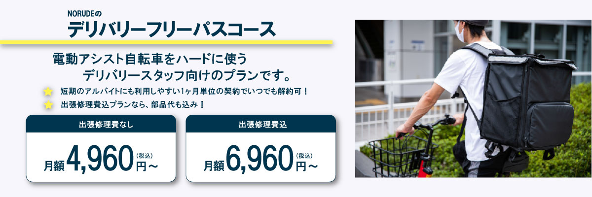PanasonicやYAMAHAの人気モデル電動アシスト自転車が、お手頃な月額4,960円からお手頃にレンタルできます!「NORUDEデリバリーフリーパスコース」を利用して、ガンガン稼働することが可能です!