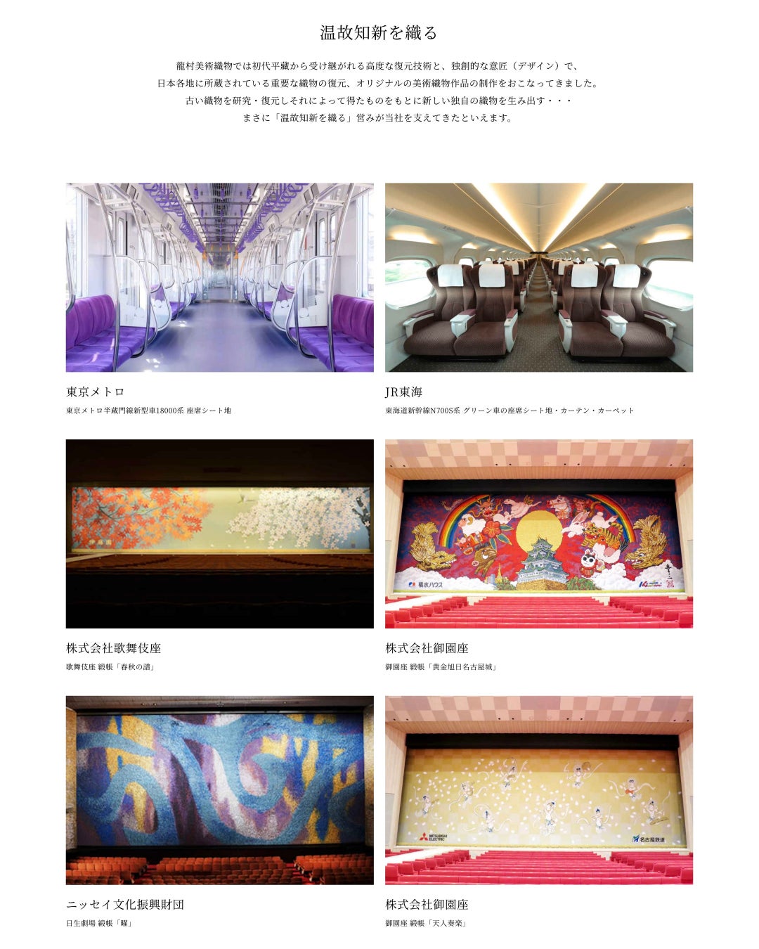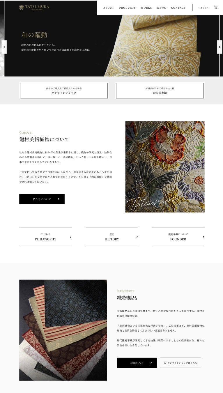 「最高之品質」− 初代龍村平藏から代々受け継がれた独創的なデザインと古代織物の復元をはじめとするクラフトマンシップ。その2つの要素が融合した『美術織物』を確立した株式会社龍村美術織物(本社:京都府京都市右京区、代表取締役:龍村育)は「和の躍動、和の解放」の精神で美術織物を現代の世界へ発信すべく、公式ブランドサイトでは、その世界観を存分に体現。文化的価値を誇る作品の数々や復元事例を紹介するためリッチなコンテンツが設けられています。