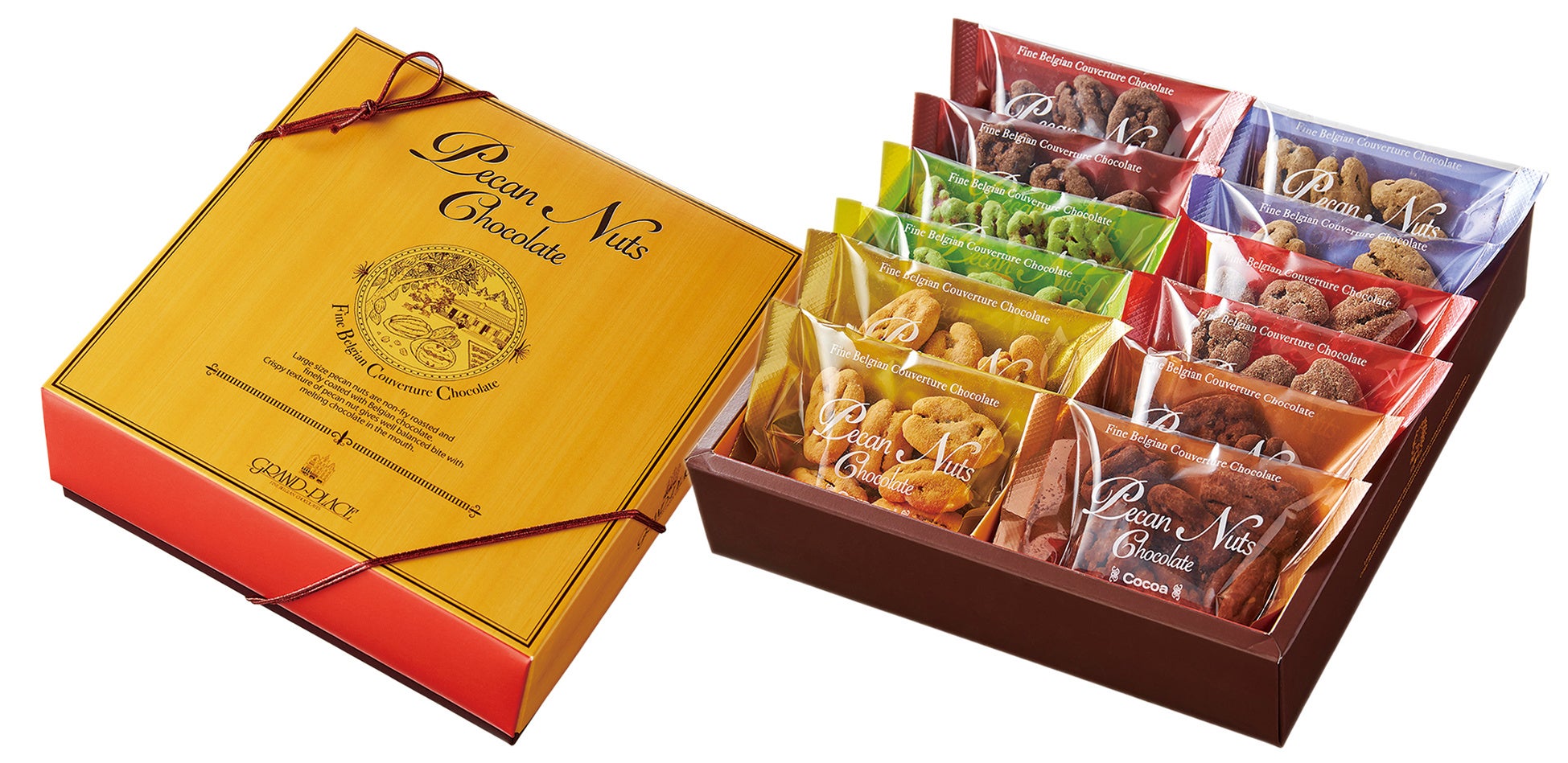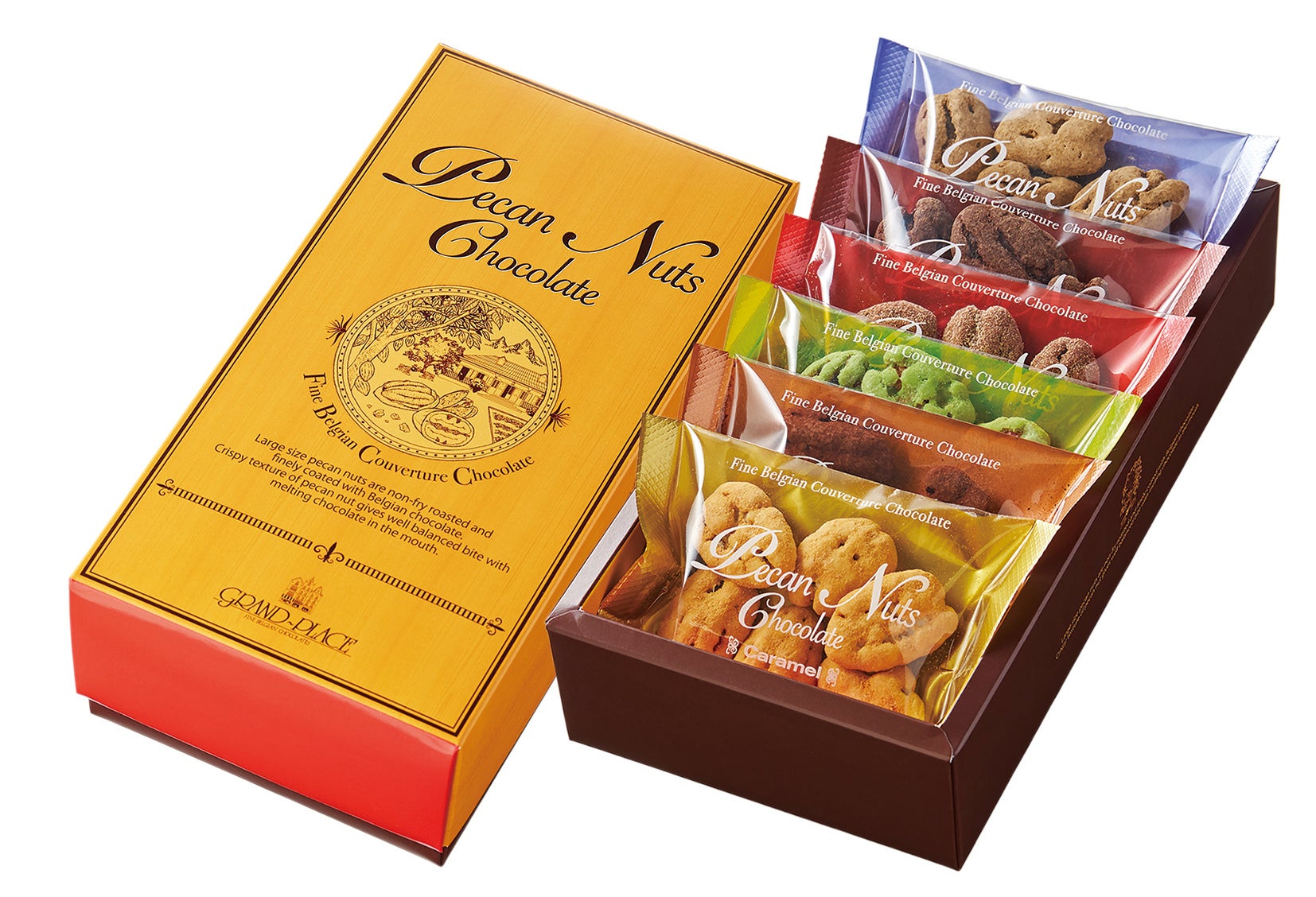 ペカンナッツの香ばしさとチョコレートの絶妙な甘さのバランスで、幅広い層に人気のベストセラー。カリッとしたペカンナッツがチョコレートと相まってすっと溶ける驚きの食感と味わいです。