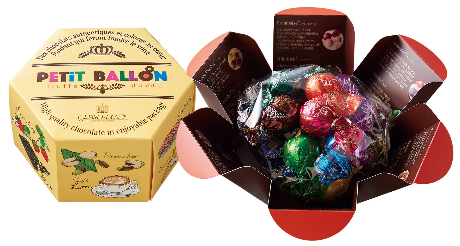 パッケージは、ベルギー ブリュッセルのグランプラス広場の華やかなフラワーカーペットをイメージ。キュートなショコラに花を添えます。
