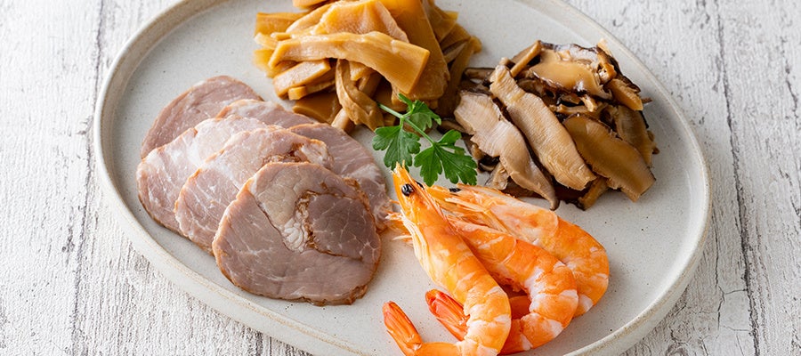 見た目の華やかさを演出する色鮮やかな「有頭海老」。豚肩ロースをオリジナルのタレで焼き上げた「チャーシュー」。椎茸を醤油・水あめで甘辛く煮込みカツオの香りを加えた「椎茸の含め煮」。食感にアクセントを加える肉厚で歯ごたえのある「メンマ」。