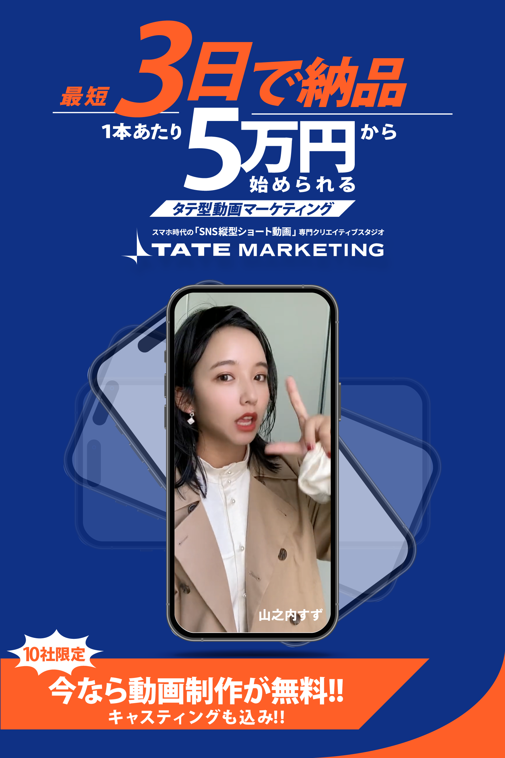 そして「TATE MARKETING」のリリースを記念して、10社数限定で約100万円相当の縦型ショート動画制作が無料になるキャンペーンを開催します。「縦型で広告を配信したいけど動画素材がない」という声に応えた内容となっておりますので、この機会にぜひお問い合わせください。