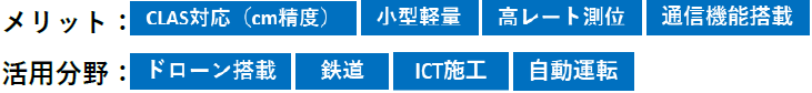 また、受信機・アンテナともに小型軽量のため、大型の重機や車両だけでなく小型ドローンへの搭載や人の携帯が可能となり、加えて100Hz出力対応のため鉄道や車両などの速度の速い移動体での利用にも適しています。