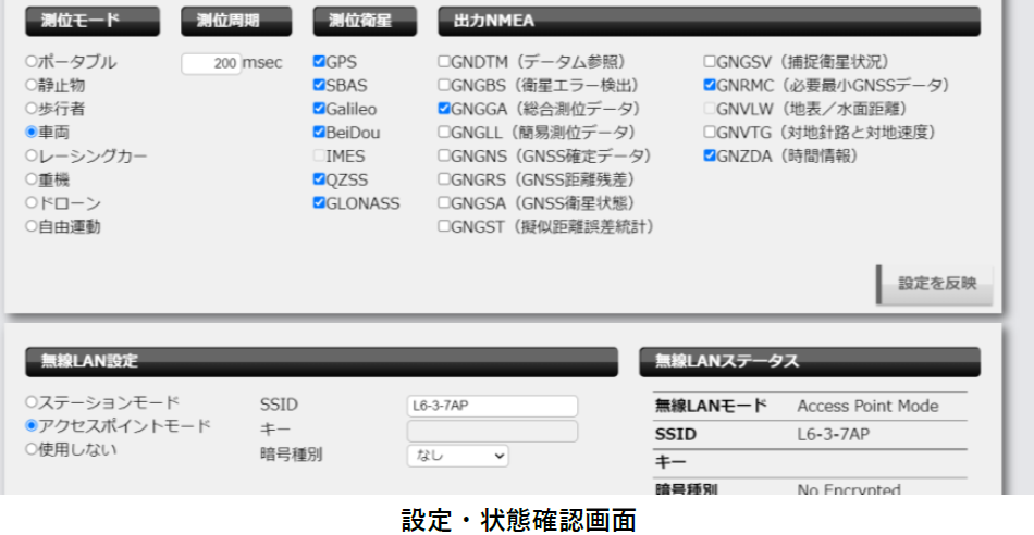 スマートフォン端末、PC 端末にインストールされたウェブブラウザから受信機の設定・状態確認を行うことができます。スマートフォン端末、PC との接続は Wi-Fi または Bluethooth で行います。受信機で測位した結果を Wi-Fi または Bluethooth で取得することが可能です。