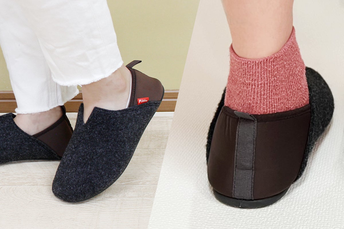 かかとがクッション性のある生地なのでバブーシュとして踏んで履いても痛くない。