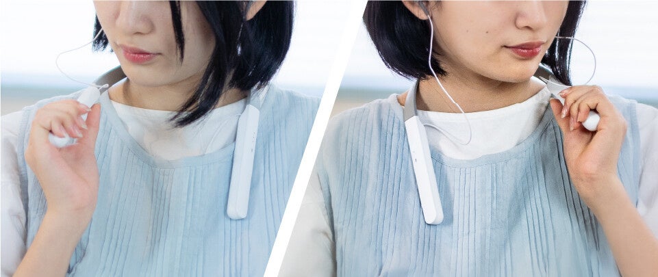 本体デザインは従来モデルのペンダント型から、見た目も目立ちにくいスタイリッシュなネックバンド型デザインに大きく姿を変えました。操作パネルを本体の裏側に配置することで、スマートな印象に仕上げています。