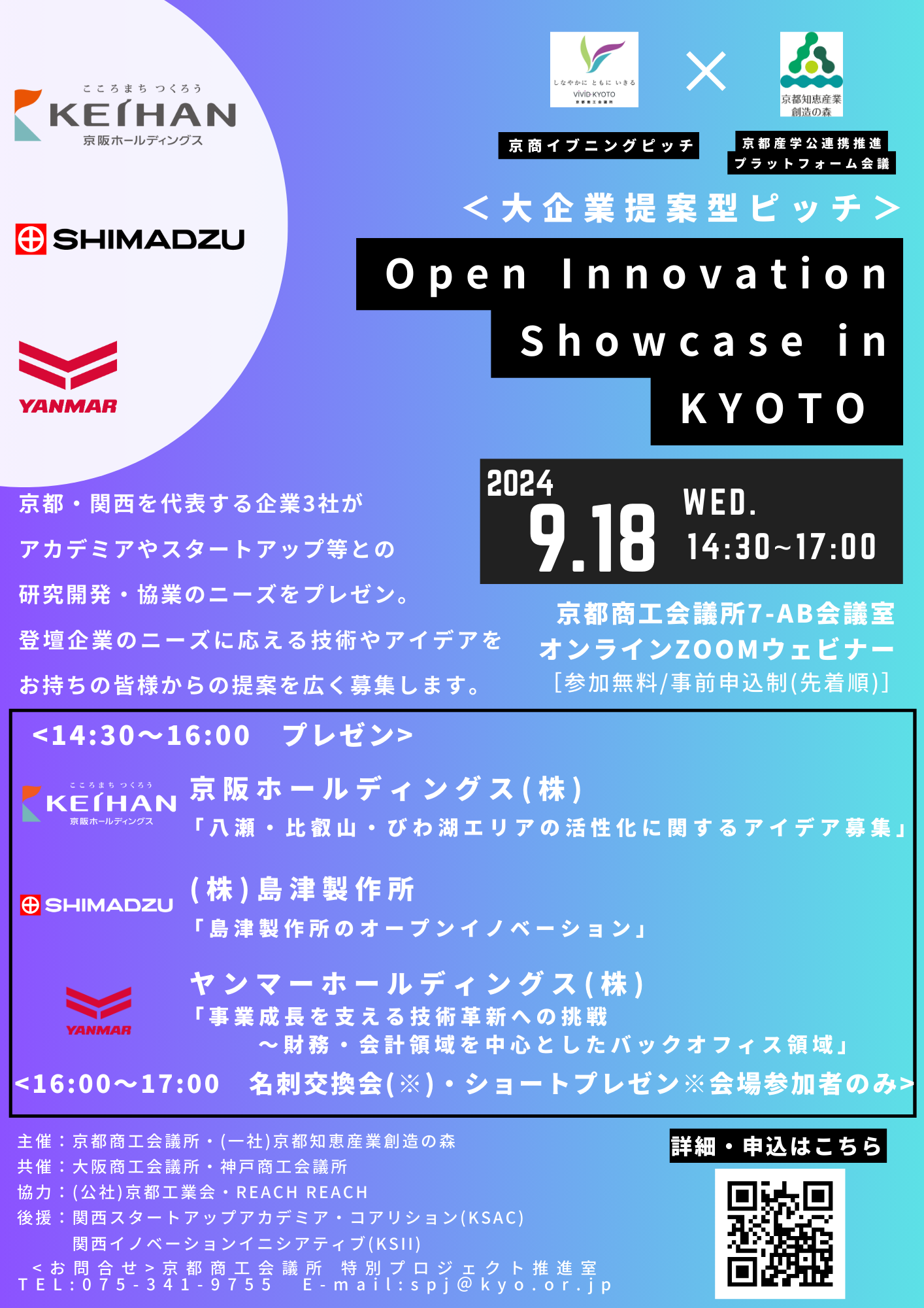 (一社)京都知恵産業創造の森、京都商工会議所では、大企業提案型ピッチイベント「Open Innovation Showcase in KYOTO」を令和6年9月18日(水)に開催いたします。今回で2回目の開催となる本イベントでは、京阪ホールディングス株式会社、株式会社島津製作所、ヤンマーホールディング株式会社に登壇いただきます。登壇企業との共同研究、開発・協業を希望する大学研究者やスタートアップの皆様はぜひご参加ください。
