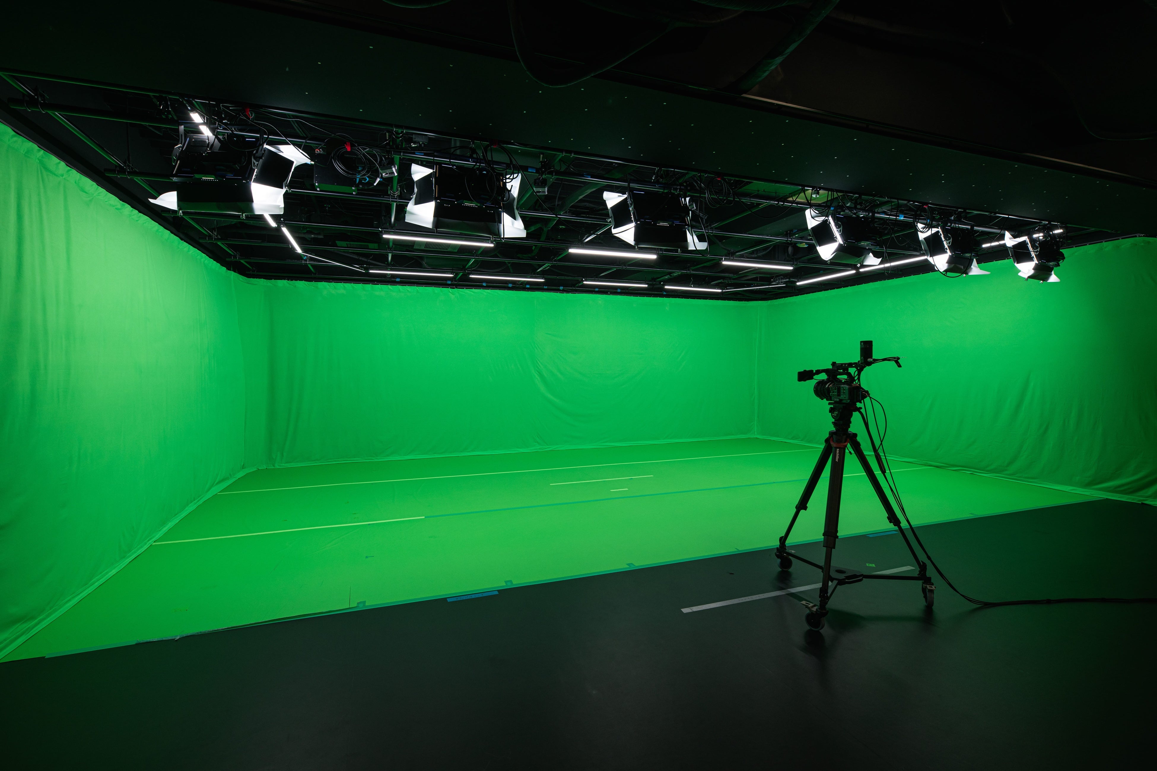 「代官山メタバーススタジオ」では、グリーンバックや大型LEDディスプレイを用いて、リアルタイムに人物とCG背景を合成し撮影することができます。これにより、ロケーション撮影が難しいといった地理的制約や、日照時間・天候といった自然条件に左右されない制作が実現できます。また、CG撮影後に必要な背景と人物の合成作業が大幅に短縮されるため、従来の編集作業の効率化が期待されます。