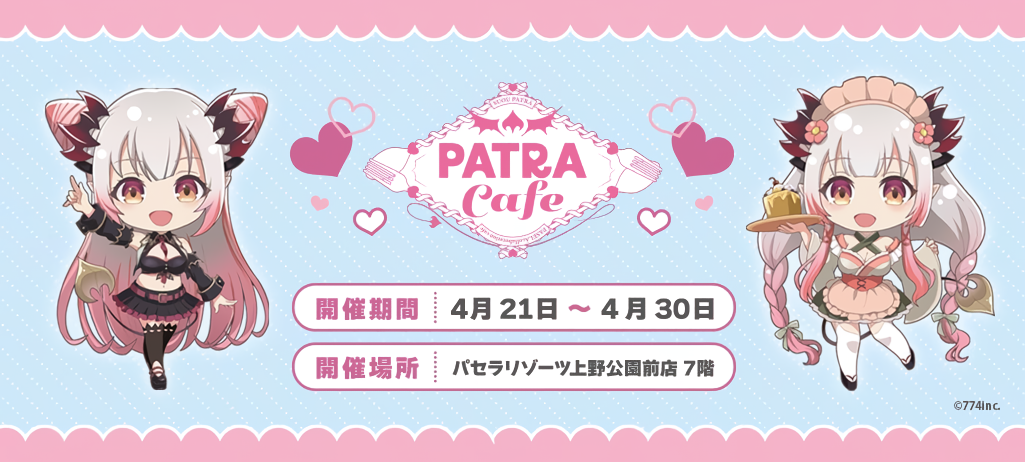774株式会社(本社:東京都新宿区、代表取締役社長:西岡明彦)は、弊社が運営するVTuberプロダクション「ななしいんく」に所属するVTuber「周防パトラ」が、株式会社ニュートン(本社:東京都新宿区、グループ代表CEO:荻野勝朗)の運営する<カラオケパセラ上野公園前店>とコラボレーションしたカフェを、2023年4月21日(金)~4月30日(日)まで、カラオケパセラ上野公園前店で開催することをお知らせいたします。