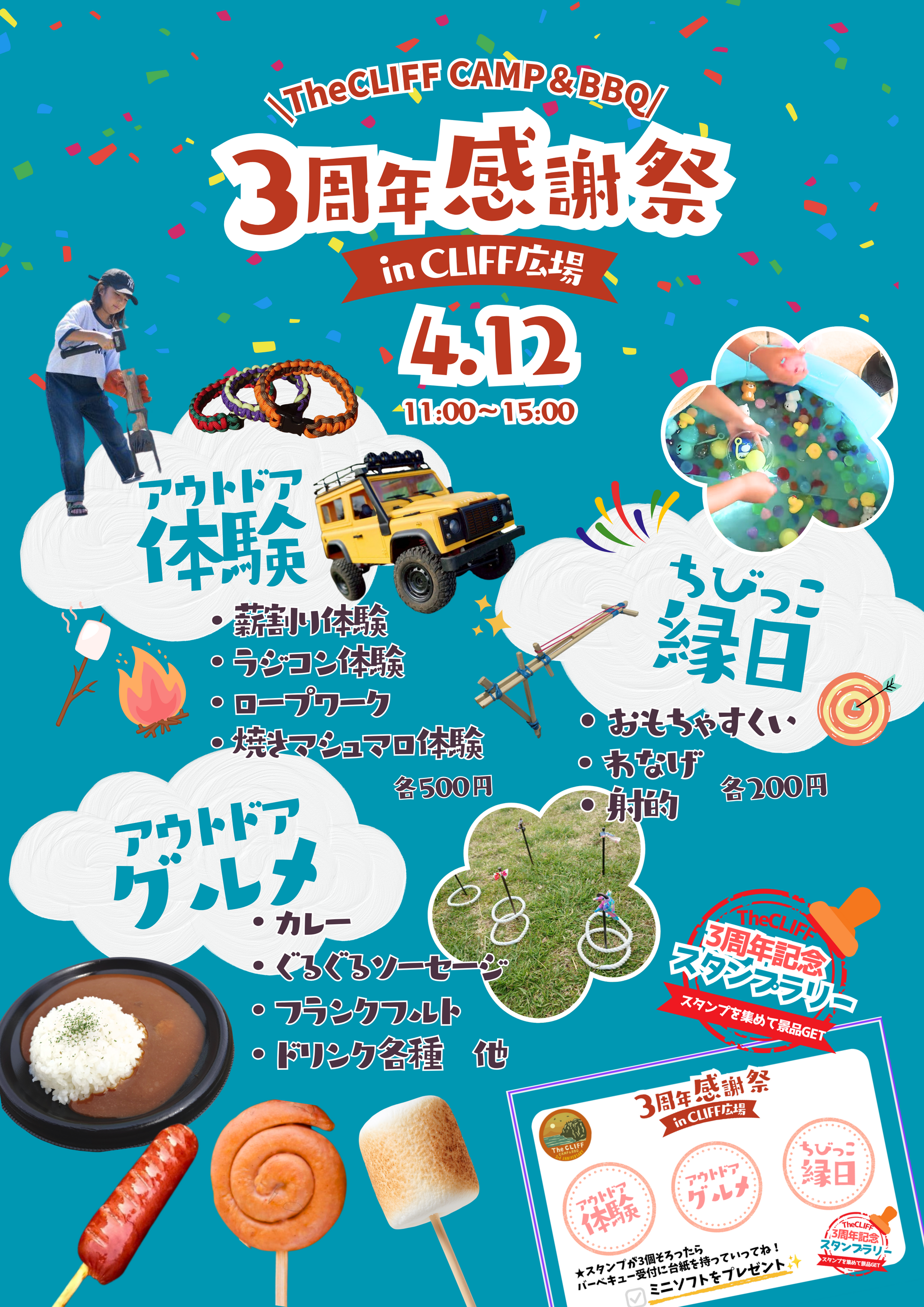 2026年4月12日 The CLIFF CAMP&BBQ 開業3周年記念 感謝祭 開催!!