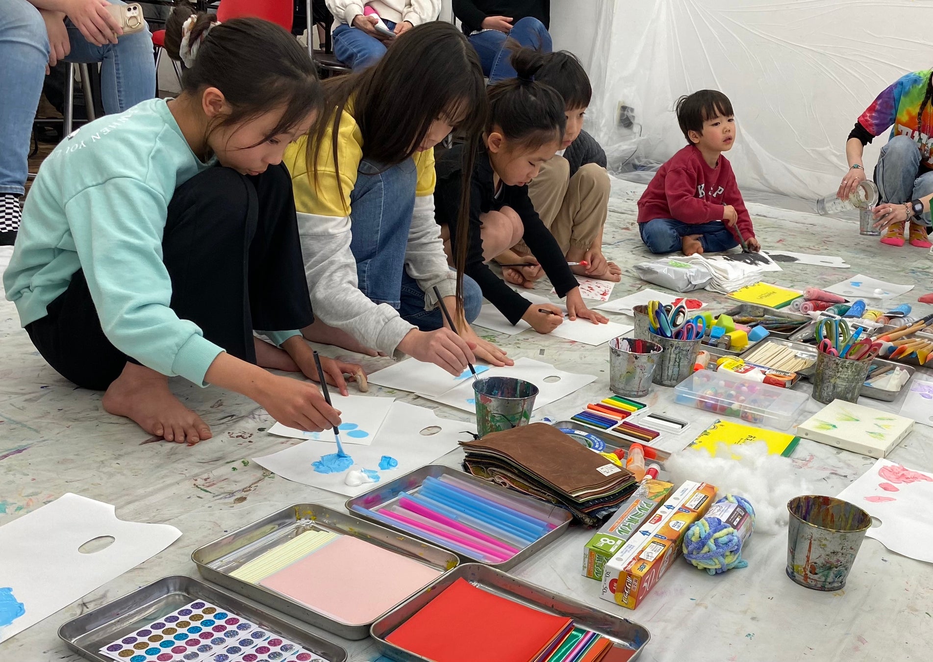 画材をお届けするだけでなく、子どもたちに体験としてアートに触れるきっかけづくりを行うため、国内外それぞれの子どもたちとアートワークショップを行う活動も実施しています。