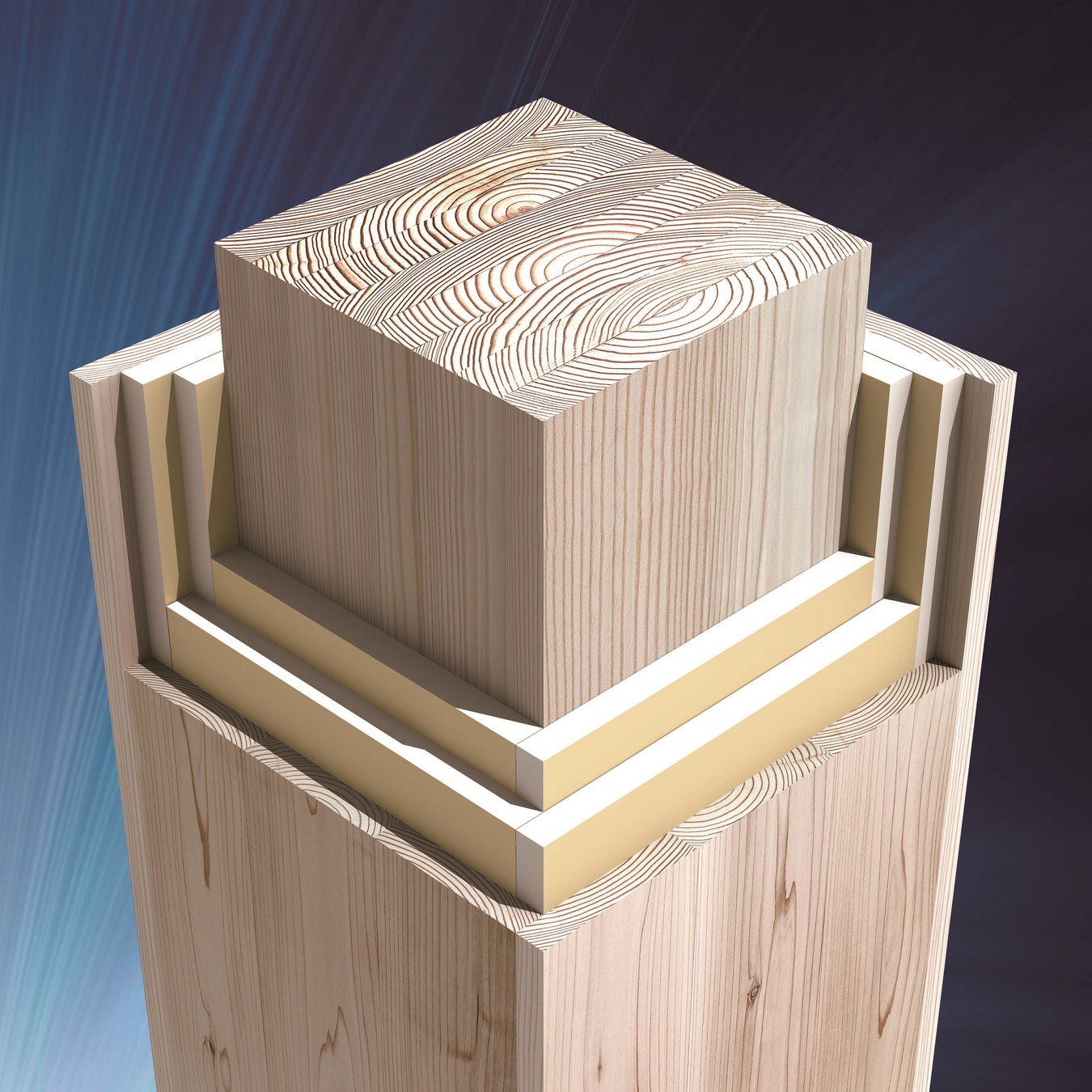 1、1.5、2、2.5、3時間の国土交通大臣認定を取得し、(2、3時間は日本初)日本、カナダ、スイスで特許を取得しています。中心部の「荷重支持部」にはスギ以上の比重がある樹種を選択でき、製材、集成材、LVL、CLTなどが使用可能です。