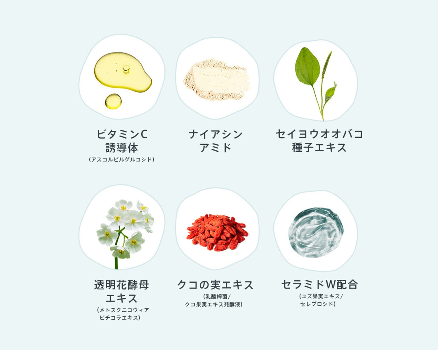 さらに、W配合したセラミド※7 の高い保湿力が乱れがちなバリア機能をサポートし、明るい印象※6 へ導きます。