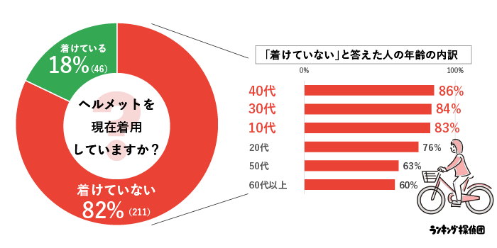 ・257人の自転車ヘルメット着用率は18%。年齢別だと40代が最も着用していない