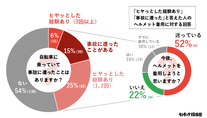 事故や危険な目に遭っていても、ヘルメットの着用を迷っている人が半数