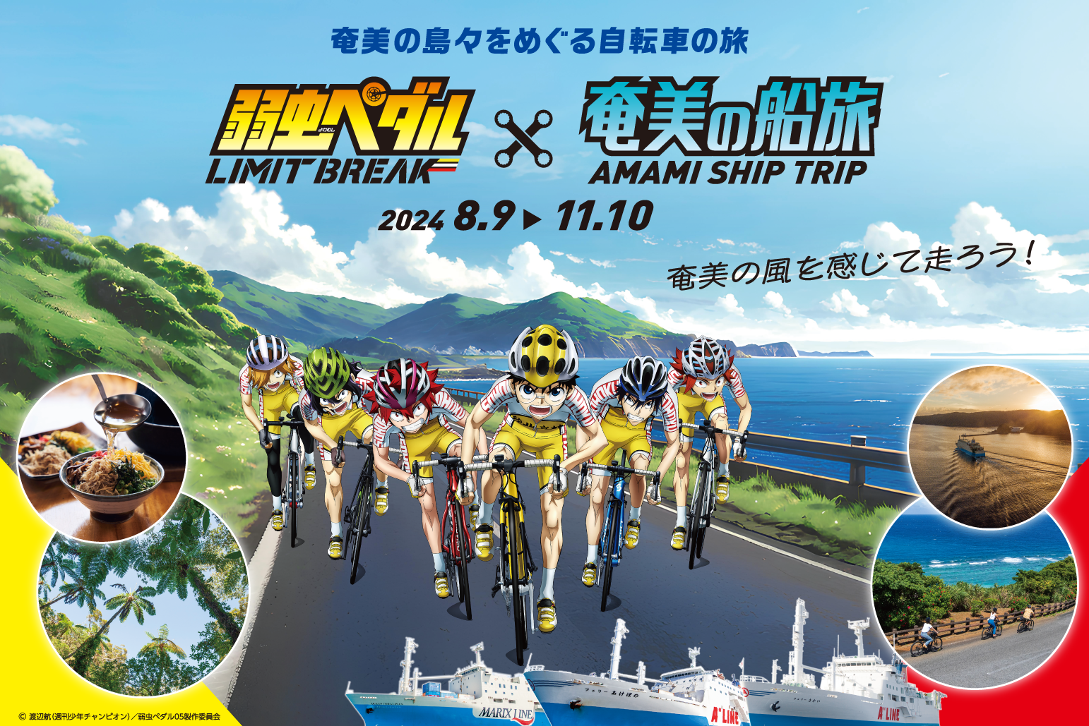 鹿児島県旅客船協会(会長:有村和晃・マルエーフェリー株式会社 社長)は、奄美の島々を結ぶフェリーの利用促進を図り、世界自然遺産の「奄美大島・徳之島」を含む奄美群島の船旅を楽しんでもらうために、フェリーを利用しながら奄美群島内の観光地を巡る『弱虫ペダルLIMIT BREAK×奄美の船旅~奄美の島々をめぐる自転車の旅~』を、2024年8月9日(金)より開催します。