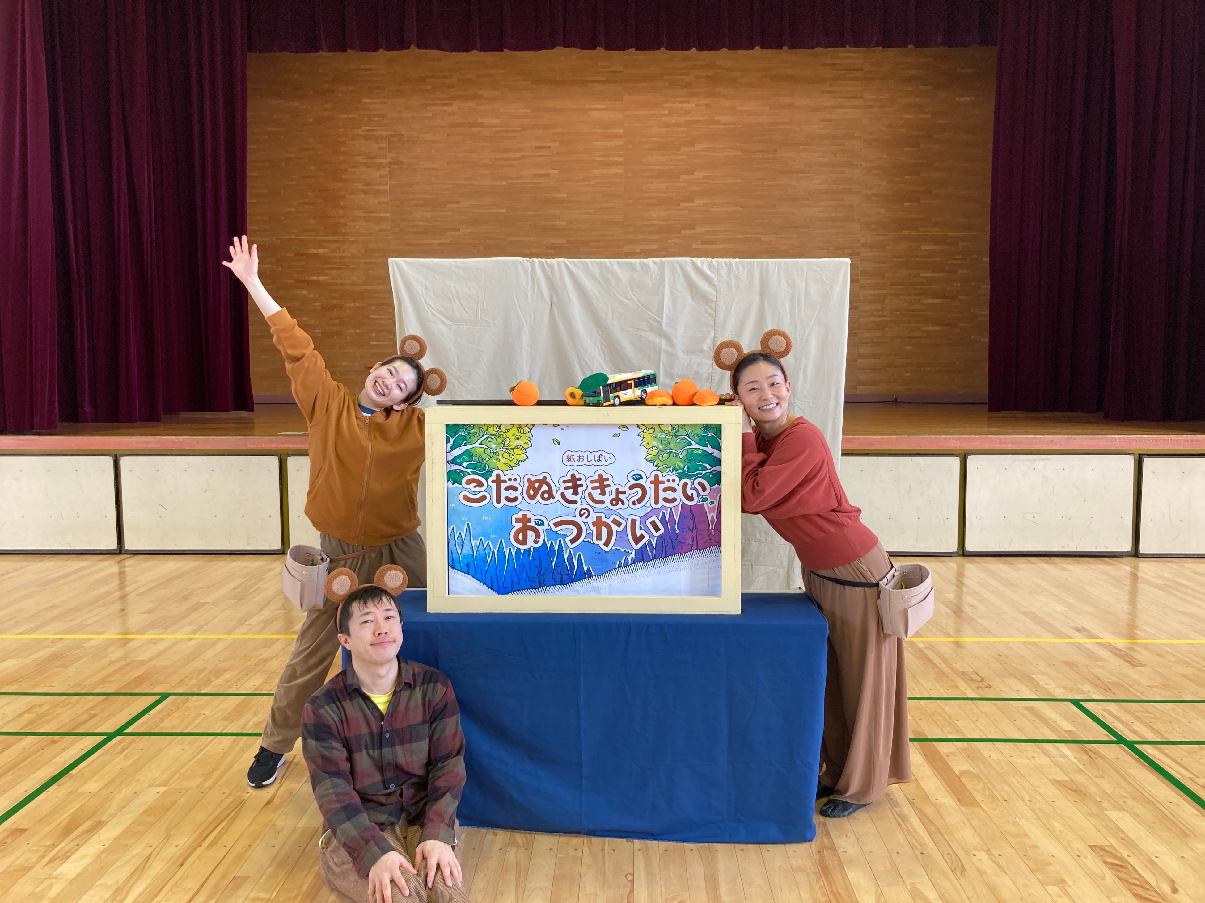 大きな紙芝居を背景に場面を切り替えながら、少人数の俳優が演技を行う「紙おしばい」。乳幼児から保護者の方と一緒に楽しむことができる演劇公演です。「守り、守られる関係の大切さ」がテーマの優しい家族の物語を今年も上演します。