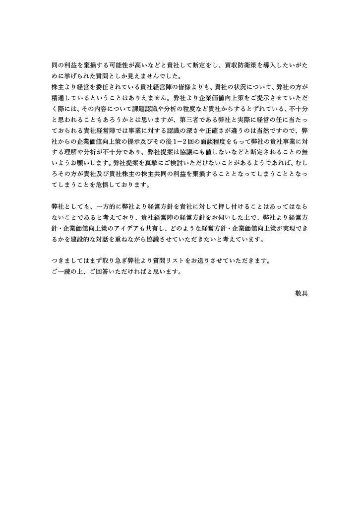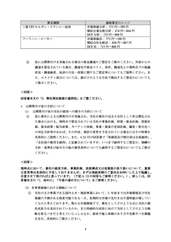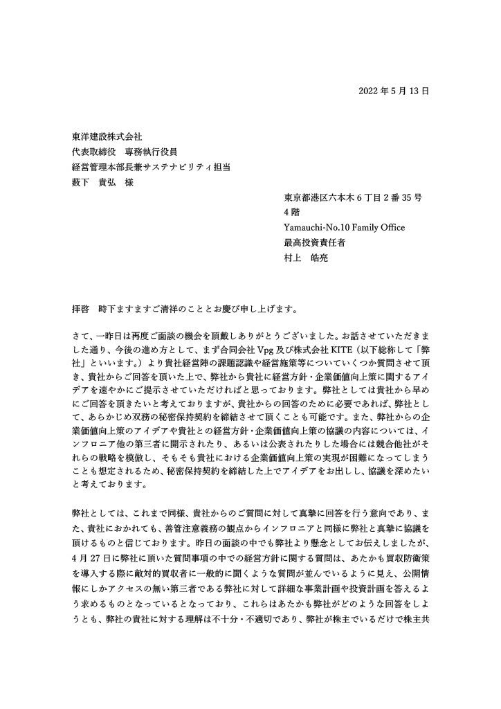 l この2回目の対話に基づき、弊社は、本日、東洋建設に対して、別紙2の通り、経営上の課題認識や経営施策等に関する質問事項をお送りし、ご回答をお願いいたしました。加えて、東洋建設が弊社の質問に対する回答のために秘密保持契約の締結が必要であるとご判断される場合に備えて、併せて本日、秘密保持契約書のドラフトもお送りしており、出来るだけスムーズに、両者で建設的な協議を進められることを期待しております。さらに、弊社として検討している東洋建設の経営方針及び企業価値向上策については、遅くとも5月16日(月)には東洋建設に対してご提示する予定です。