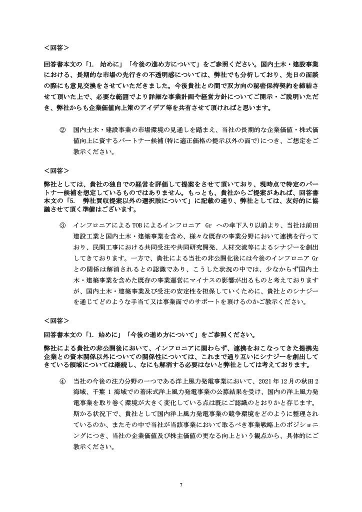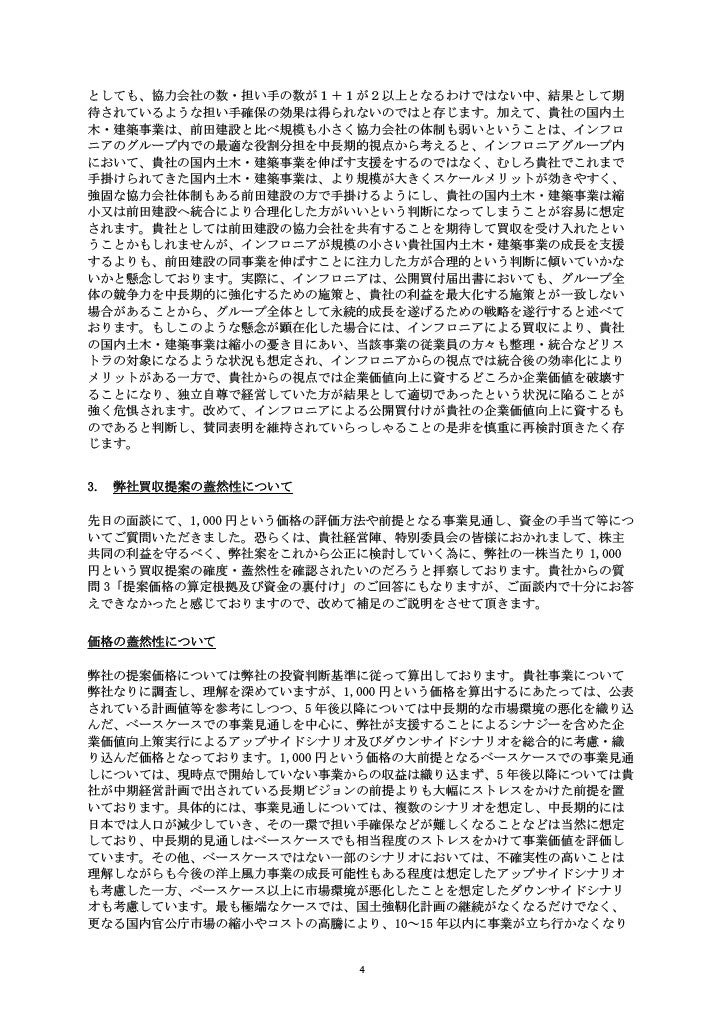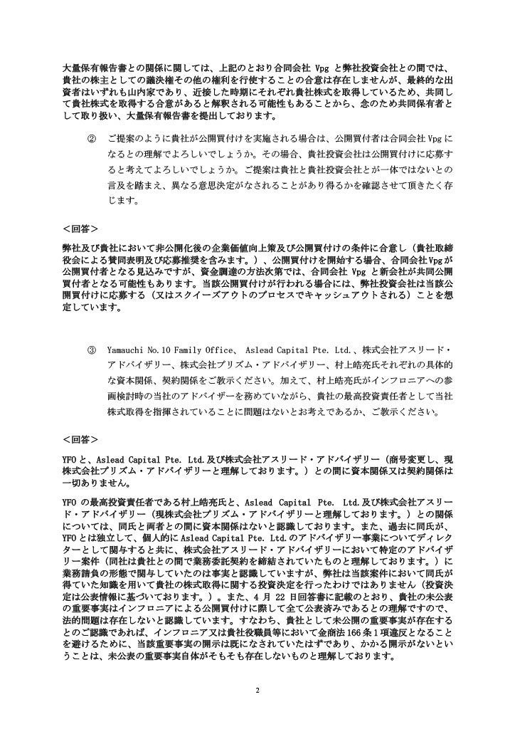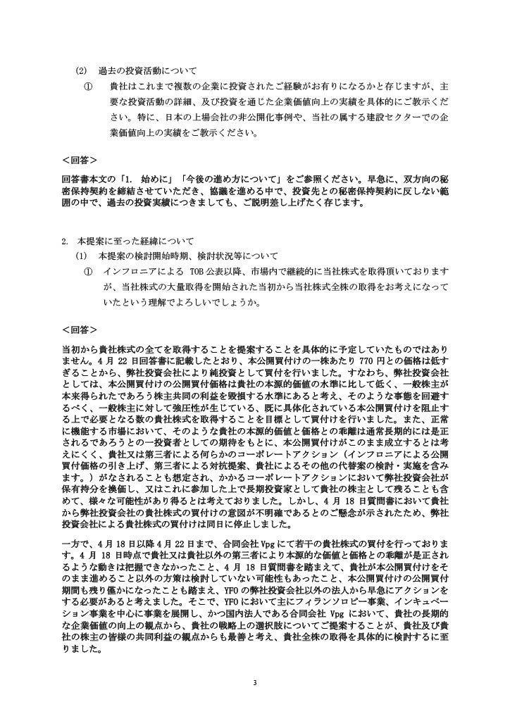 l また、同回答書においては、弊社より、弊社事業会社である合同会社Vpgによる買収提案の蓋然性についてご説明するとともに、合同会社Vpgの買収提案を真剣に検討をしていただきたい旨、そして、一般株主の皆様に強圧性を生じさせる恐れのある、現在の市場株価よりも低い価格のインフロニア・ホールディングスによる公開買付けへの賛同表明を維持していることを再検討していただきたいこと等をお願いしております。これらについては現時点でまだ経営陣より書簡等でのご回答はいただいておりません。