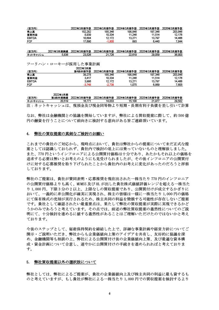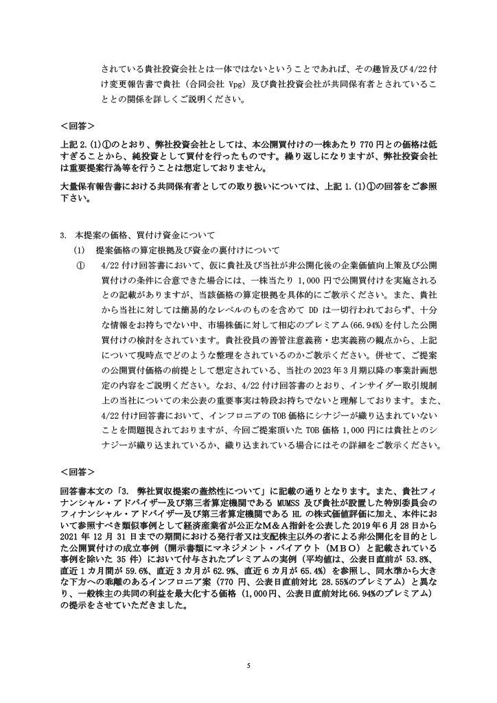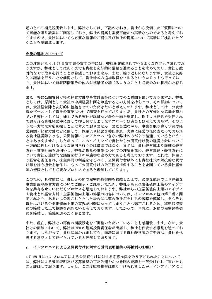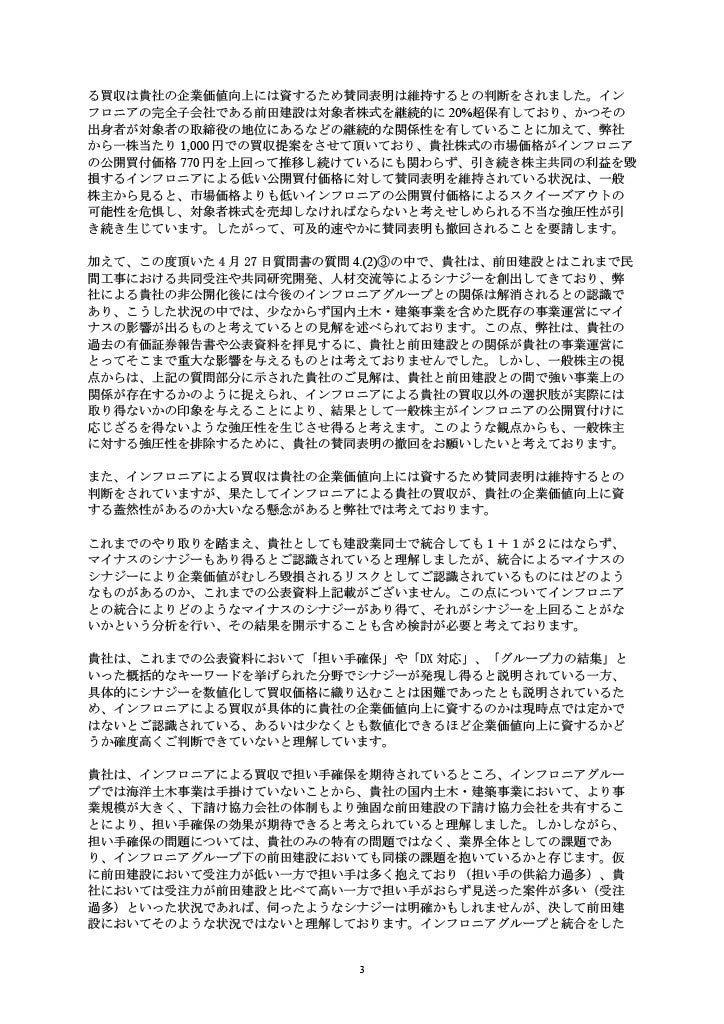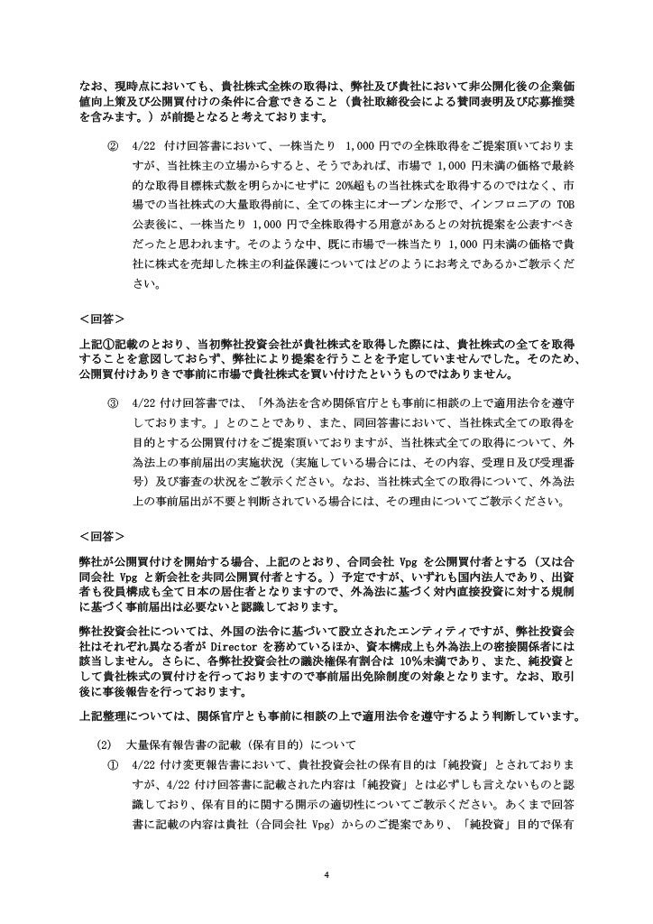 l また、同回答書においては、弊社より、弊社事業会社である合同会社Vpgによる買収提案の蓋然性についてご説明するとともに、合同会社Vpgの買収提案を真剣に検討をしていただきたい旨、そして、一般株主の皆様に強圧性を生じさせる恐れのある、現在の市場株価よりも低い価格のインフロニア・ホールディングスによる公開買付けへの賛同表明を維持していることを再検討していただきたいこと等をお願いしております。これらについては現時点でまだ経営陣より書簡等でのご回答はいただいておりません。