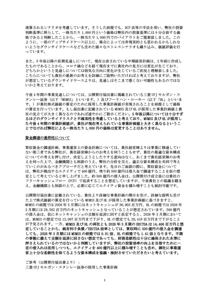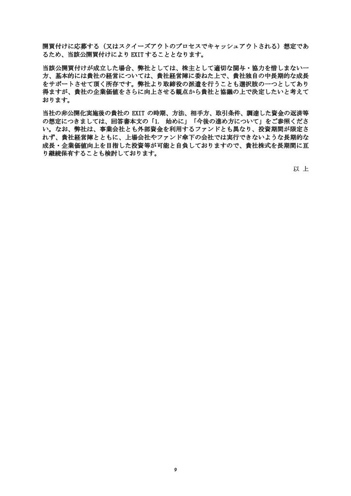 l また、株主共同の利益に資する合同会社Vpgからの1,000円での100%買収の提案についての蓋然性に関しては既に真摯にご回答差し上げているので、取締役会にて真剣に検討をしてほしい旨をお伝えいたしました。