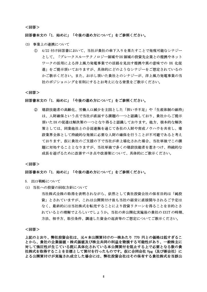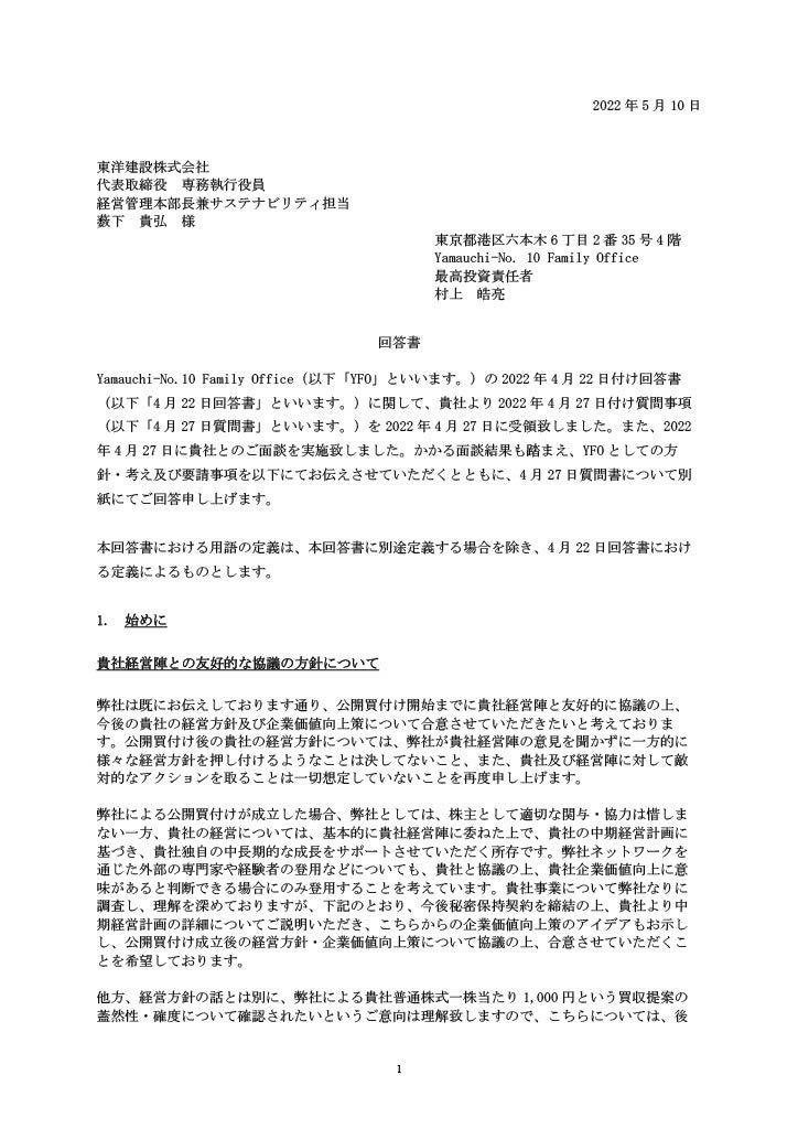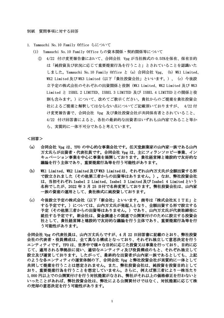 l また、同日付で、東洋建設より弊社および弊社投資会社に関する質問事項を受領致しました。当該質問事項に対しては、5月10日に、別紙1の回答書とおり、弊社より真摯に回答を行っております。当該回答書では、質問事項に含まれていた、弊社、弊社の事業会社である合同会社Vpg、弊社投資会社であるWK1 Limited, WK2 Limited及びWK3 Limitedの詳細、弊社の最高投資責任者が過去に東洋建設が採用していたアドバイザリー企業に弊社とは関係なく個人的に関与していたこと、弊社投資会社の外為法の遵守状況及び大量保有報告書の取り扱いのご説明等について誠実にご回答すると共に、これらについて、追加での質問事項があれば真摯に回答する旨を東洋建設にお伝えしておりますが、現段階では追加の質問事項はいただいておりません。